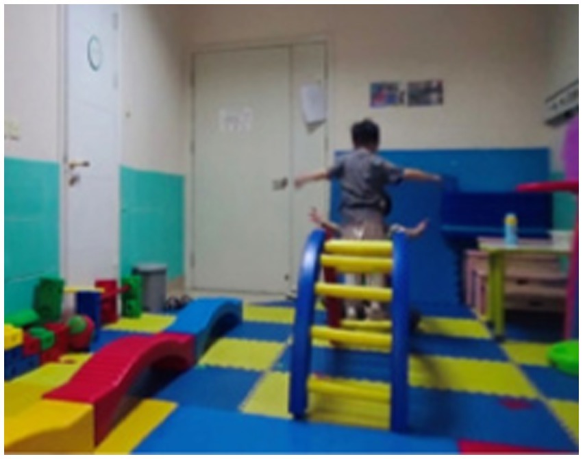 Figure 7. A child with arms open to the therapist. What can be clearly seen in the picture on the left is the moment when the child spreads their arms wide and runs to the therapist immediately upon getting off the jungle gym.