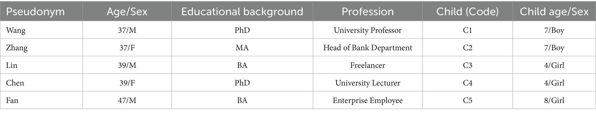 All participants used pseudonyms to ensure anonymity. They were residents of Beijing, China, and aged 37–47 years. Each had only one child, except for participant Fan who had two daughters. All five children, aged 4–8 years, were diagnosed with ASD at approximately 3 years of age. Their behavioral characteristics exhibited significant heterogeneity: C1 displayed narrow interests and stereotyped behaviors; both C2 and C5 exhibited pronounced social anxiety, and C5 also experienced language regression; C3 and C4 shared difficulties with emotional regulation, which manifested as excessively heightened and uncontrollable emotional expressions. At the time of the study, the children had received at least 7 months of DMT, with the longest course of treatment being 4 years. Table 1 presents participating parents’ basic information.