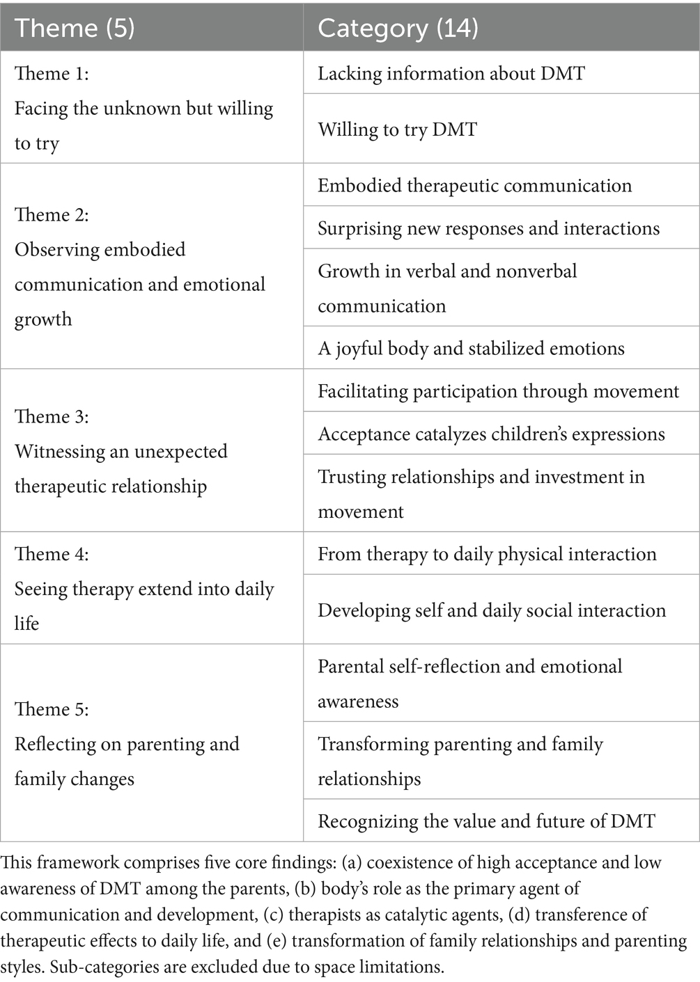 In addition, most parents felt that their children exhibited many positive changes in emotional expression after participating in DMT, and significantly improved in their emotion-regulation abilities. Lin stated that after receiving DMT, the frequency, duration, and intensity of his child’s emotional attacks significantly diminished. Furthermore, Chen’s child’s emotional expression became more stable. These positive changes were not only observed during DMT but also confirmed in their other daily environments outside the treatment room. Moreover, Zhang and Fan found that their children’s mood had become more optimistic during the DMT process. In fact, sensory stimulation and physical contact may have lifelong impacts on a child’s development, as these interactions can influence the brain’s internal connectivity and activation patterns (Bloom, 2006; Hammond, 2009). Therefore, DMT may multidimensionally influence children’s development via movement and non-verbal interaction. Literature indicates that DMT can enhance children’s emotional recognition abilities and prompt the use of internal emotional coping resources and appropriate external expression of emotions (Fischer and Chaiklin, 1993; Mohan, 2020; Scatozza et al., 2023).