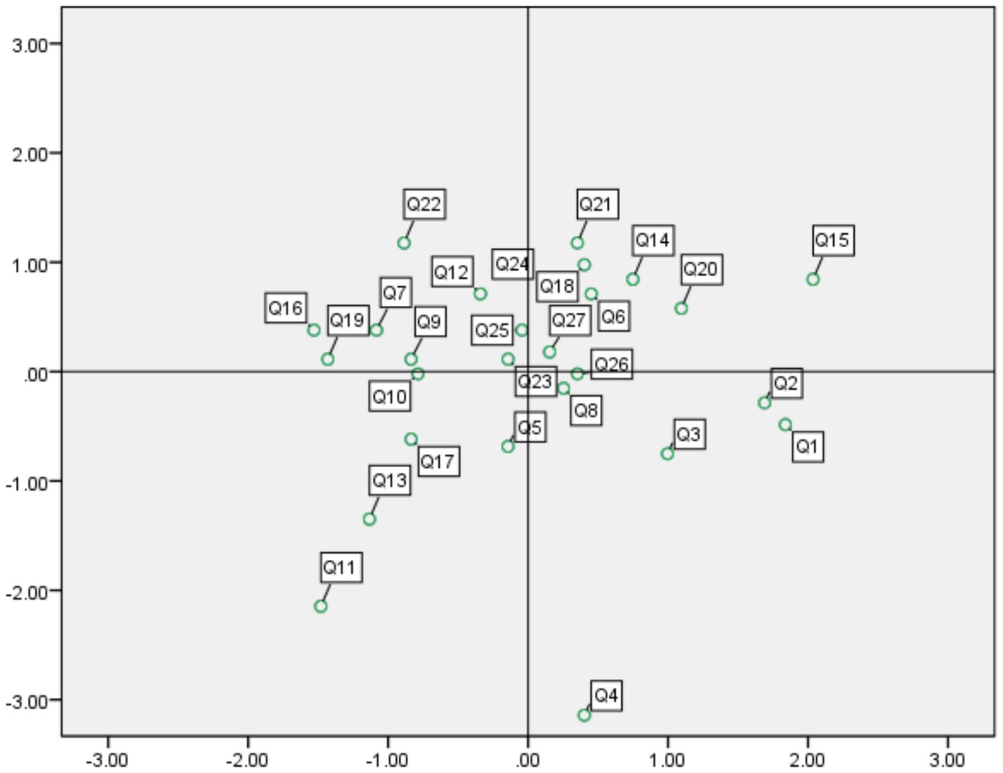 Using principal component analysis with varimax rotation, we extracted and named the latent constructs underlying the 27 items. After rotation, three factors emerged. The eigenvalues for factors 1–3 were 9.281, 8.024, and 7.559, respectively, accounting for 34.38, 29.72, and 27.99% of the variance (cumulative variance explained = 92.09%). See Table 3 for details.