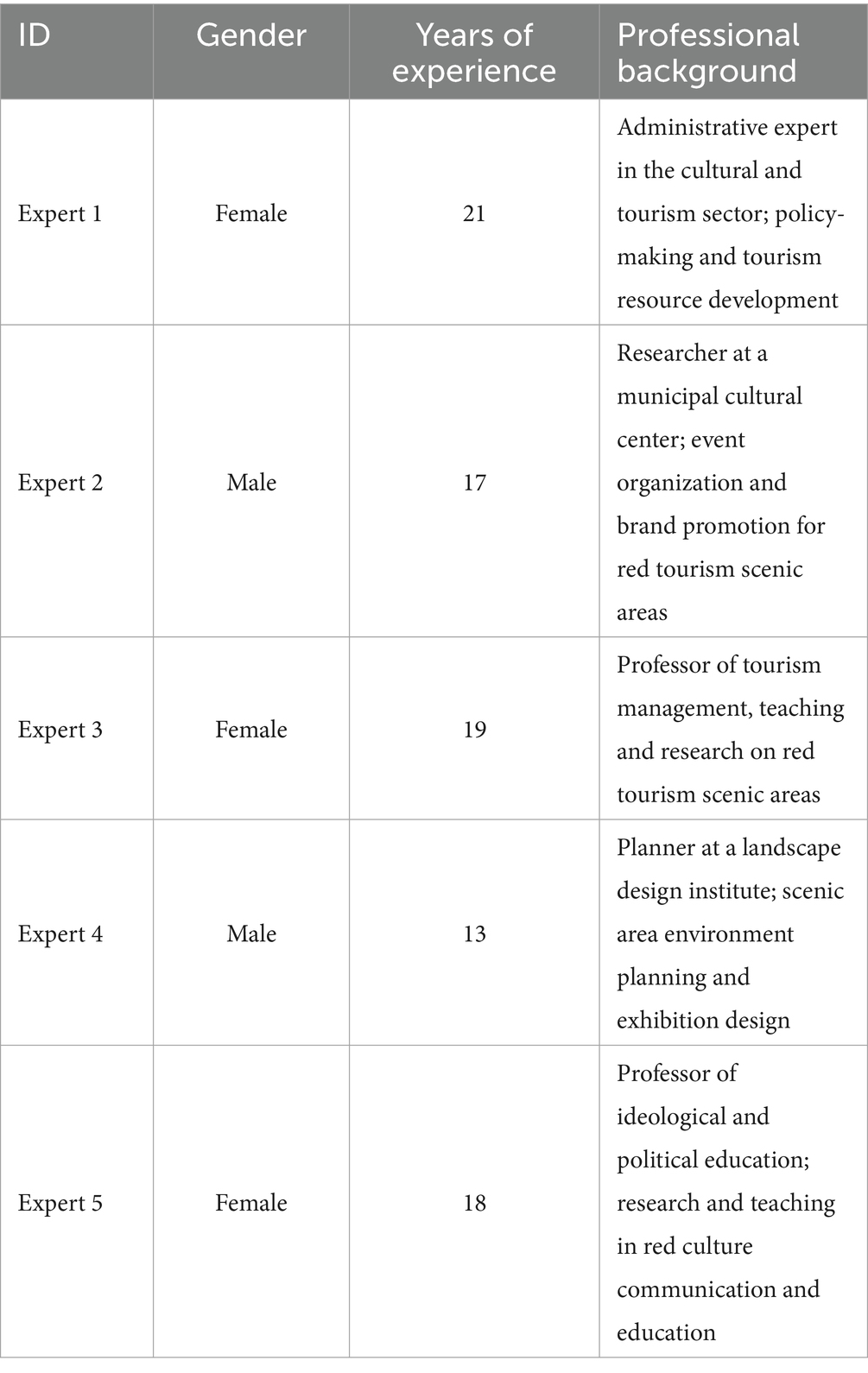 To construct evaluation criteria for Guangzhou’s red tourism scenic areas, expert interviews were first conducted to understand how practitioners assess development effectiveness. A purposive sampling approach was adopted to recruit experts with over 10 years of practical experience in planning, management, or research on red tourism scenic areas in Guangzhou. The panel consisted of five experts: two administrative officials from the Bureau of Culture and Tourism and a municipal cultural center, one professor of tourism management, one landscape planning specialist, and one professor of ideological and political education. Table 1 presents the background information of the interviewees.