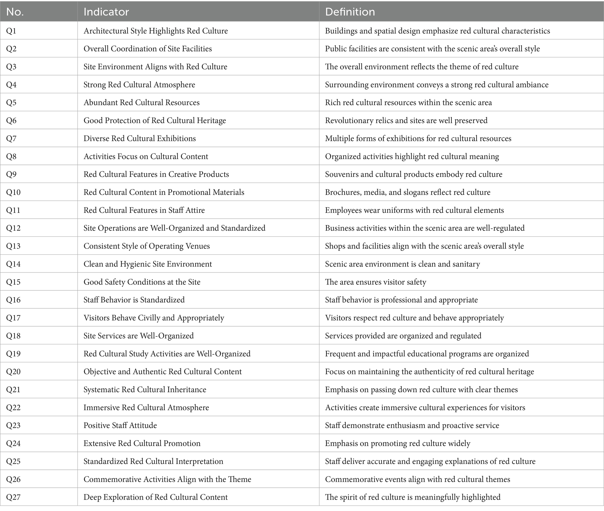 This study identifies a three-dimensional evaluation system for construction effectiveness and visitor satisfaction at Guangzhou’s red tourism sites, comprising 27 indicators. The three dimensions are identified as “Management Behavioral Norms,” “Red Cultural Connotations,” and “Landscape and Facilities.” Literature review confirms that prior scholarship has repeatedly emphasized the positive role of behavioral norms in enhancing the construction effectiveness of red tourism scenic areas: standardized services ensure efficient and orderly reception processes, thereby effectively improving the visitor experience (Zhu and Song, 2023); guiding visitors to behave in a civilized and respectful manner helps maintain a solemn atmosphere and further highlights the educational function of red tourism (Tang, 2023); strict adherence to interpretive norms of red culture guarantees historical authenticity, ideological seriousness, and communicative effectiveness (Zhang and Ran, 2024). Dai and Ma (2021) argue that extensive and in-depth promotion of cultural connotations can effectively expand the social influence of scenic areas and foster a sound educational atmosphere. Shi (2020) highlights that maintaining orderly transmission and ensuring objectivity and factual accuracy are the foundations for upholding the seriousness and authority of red culture, thereby safeguarding the credibility of educational content. Wu and Li (2021) posit that the development of culturally distinctive and meaningful red cultural and creative products can extend cultural experiences, strengthen visitor memory and emotional resonance, and that organizing commemorative activities closely aligned with central themes can reinforce ritual and appeal, embedding the red spirit in people’s hearts. Similarly, Chen et al. (2025) contend that well-designed landscape and facility construction is a critical guarantee for improving the quality and efficiency of red tourism scenic areas; sound safety conditions constitute the operational foundation, overall facility coordination enhances the touring experience, and an environment that resonates with the red theme strengthens immersive educational engagement.