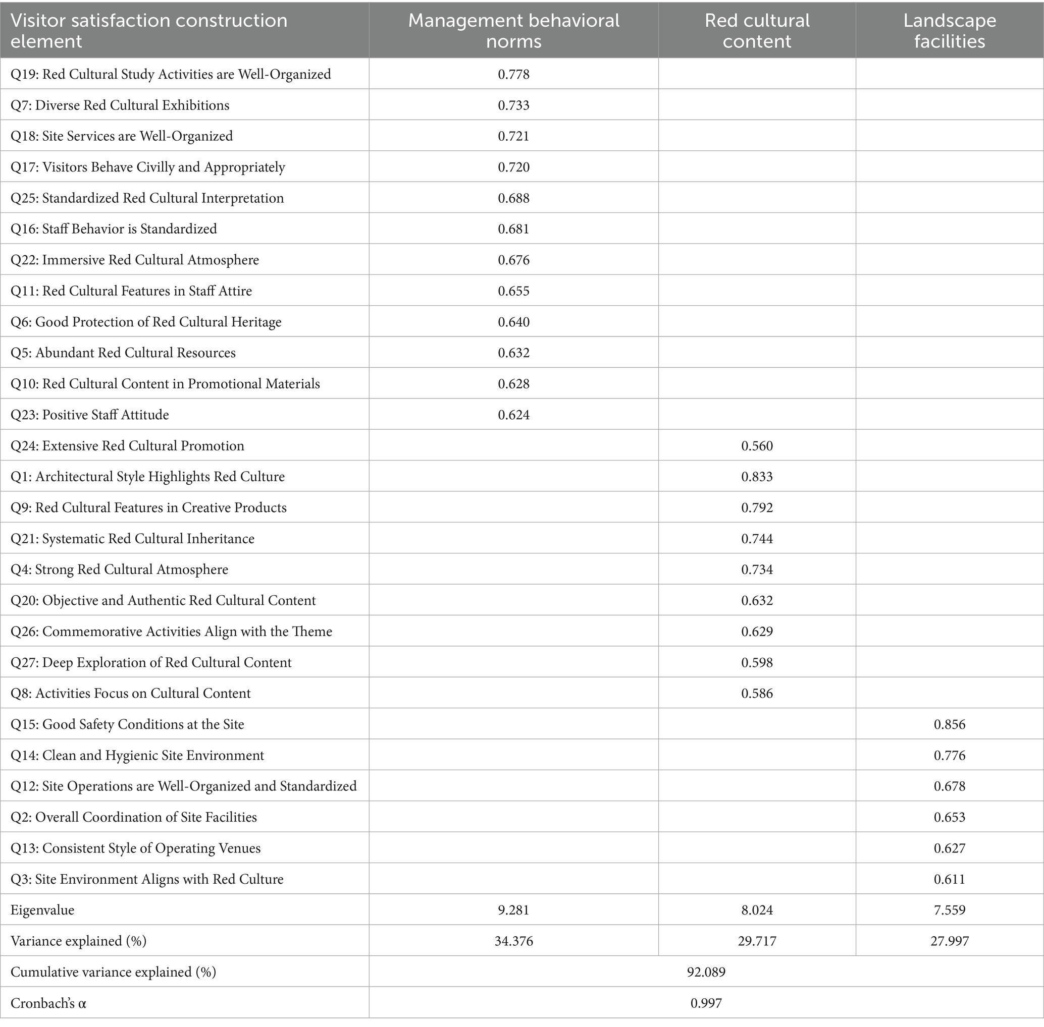 The data were adequate for factor analysis (Kaiser–Meyer–Olkin = 0.910). Bartlett’s test of sphericity was significant: χ2(351) = 6200.86, p < 0.001. This indicates that the measurement indicators exhibit good intercorrelations and are suitable for factor analysis (Gorsuch, 1983). The overall reliability (Cronbach’s α) of the 27-item scale is 0.997, and the cumulative variance explained reaches 92.089%, demonstrating very high reliability–validity and internal consistency (Bryant and Yarnold, 1995).