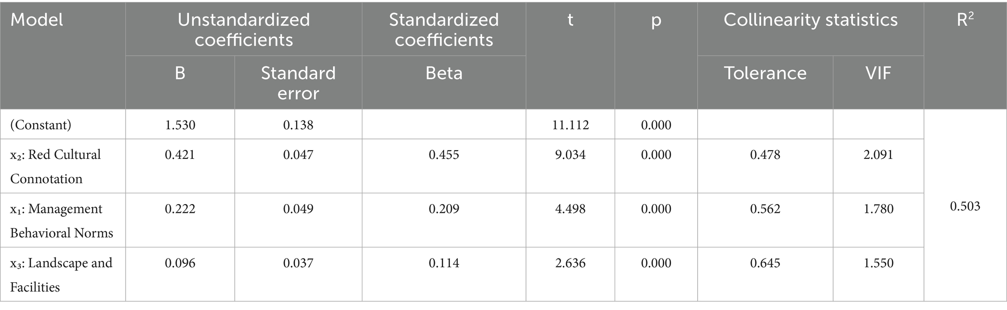 As seen in Table 4, visitor satisfaction (y) at Guangzhou’s red tourism sites is significantly related to the three basic factors—“Management Behavioral Norms” (x₁), “Red Cultural Connotation” (x₂), and “Landscape and Facilities” (x₃)—through multiple regression analysis (p < 0.01). The collinearity statistics show tolerance values greater than 0.1 and VIF values less than 10, indicating no multicollinearity problem (Chen and Wang, 2017). This suggests a significant linear relationship between the construction factors of “Management Behavioral Norms,” “Red Cultural Connotation,” and “Landscape and Facilities” and visitor satisfaction at Guangzhou’s red tourism sites. The adjusted R2 for the regression model is 0.503, which indicates a relatively high explanatory power for the model. The regression model is as follows: