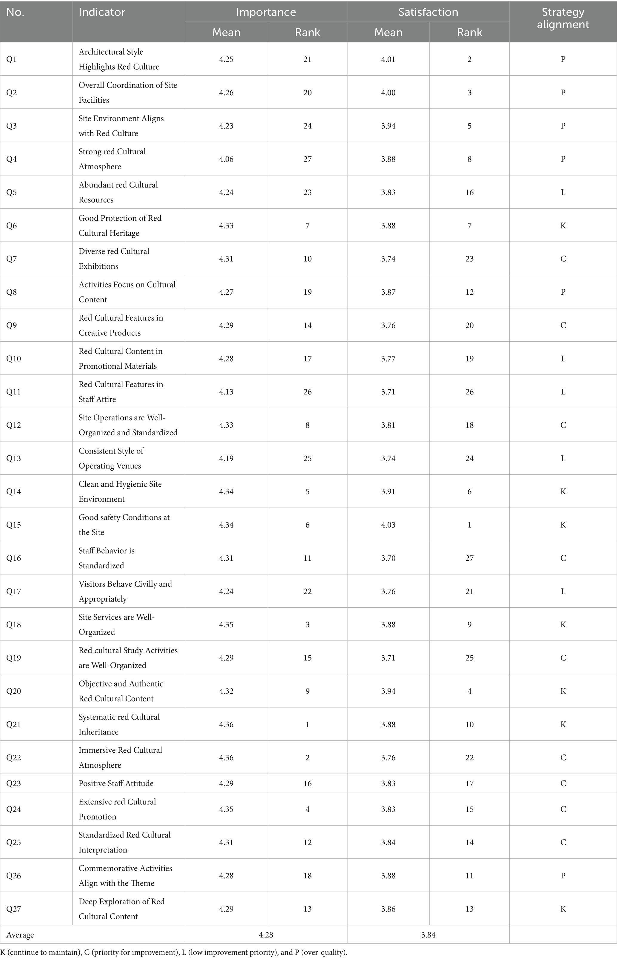 As shown in Table 5, the mean score of importance across all 27 indicators is 4.28, while the mean satisfaction score is 3.84. The mean value of importance is consistently higher than that of satisfaction, reflecting that visitors hold high expectations for the construction effectiveness of red tourism scenic areas in Guangzhou, yet actual performance has not fully met such expectations. This finding also corroborates the perspectives of Wu et al. (2023) and others, who argue that while visitors maintain elevated expectations for Guangzhou’s red tourism scenic areas, multiple performance gaps persist. Ye (2024) further suggests that visitors perceive significant discrepancies between expectations and performance in terms of the depth of cultural connotation excavation and its modern expression, the normativity and professionalism of services, and the coordination of landscape facilities. Results derived from the IPA analysis indicate that indicators requiring prioritized improvement are concentrated in the domains of red cultural connotation construction and standardized service management. Field survey comparisons further reveal that instances of integrating red cultural elements into supporting facilities remain limited and lack innovation, whereas most visitors demand higher standards for the presentation forms of red resources, red elements, and red culture, ultimately resulting in relatively low satisfaction levels.