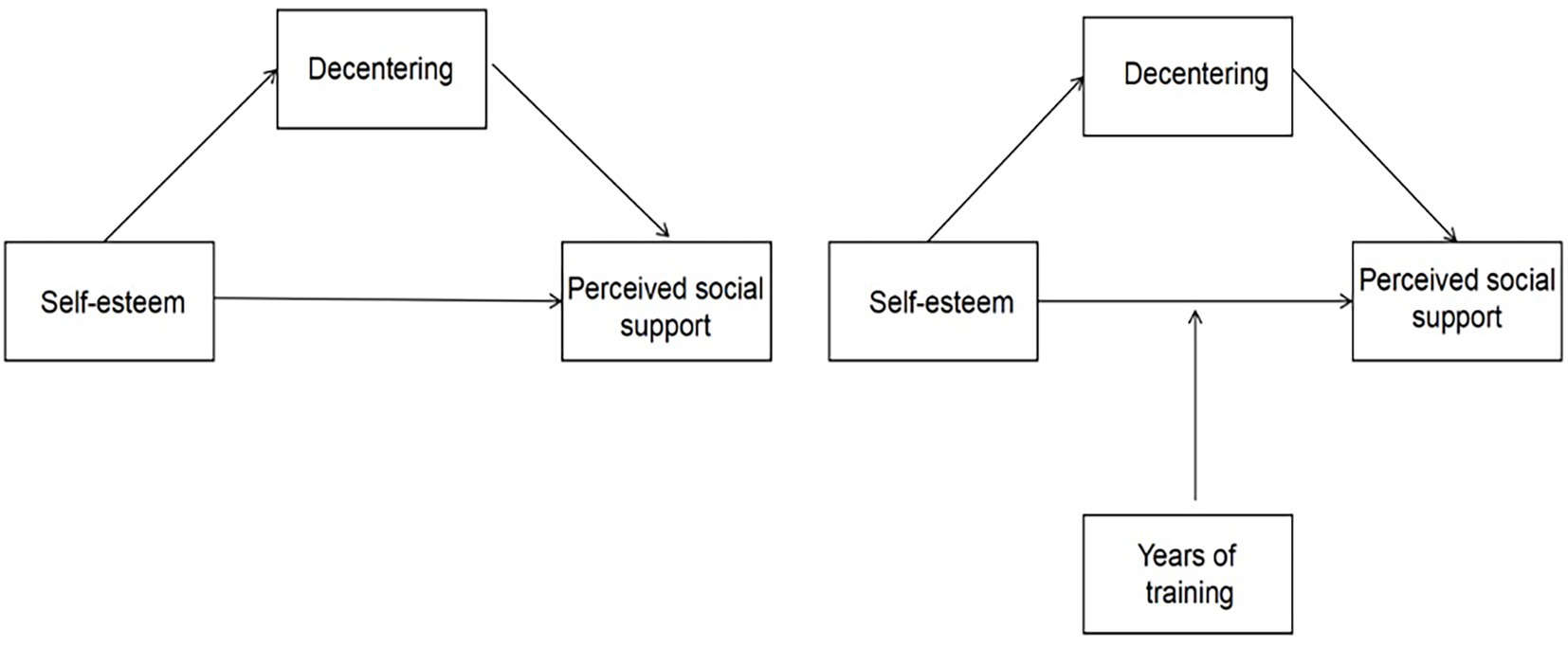 Previous research has shown that individuals’ levels of SE are closely associated with their levels of mindfulness (Chandna et al., 2022; Rasmussen and Pidgeon, 2011; Stenhaug and Solem, 2024). Although no study to date has directly examined the relationship between SE and decentering in athletic samples, it can be inferred that such a link may exist, given that mindfulness training has been shown to foster decentering. Existing research has demonstrated a strong correlation between positive emotions and athletes’ performance (Weinberg and Gould, 2023), and the ability to regulate negative emotions is critical (Goñi et al., 2024). Based on the broaden-and-build theory, such positive emotions have the capacity to expand an individual’s cognitive and attentional scope, gradually building enduring psychological and social resources. High self-esteem is often associated with increased positive emotional experiences, such as enhanced emotional regulation ability (Brown and Marshall, 2001), or a greater tendency to express and experience positive emotions, or a greater tendency to express and experience positive emotions (Caprara et al., 2022). These positive emotions prevent individuals from excessively focusing on self-evaluation or threatening information and instead enable the development of the ability to decenter from emotions and thoughts. This ability helps individuals maintain psychological flexibility when facing negative emotions or stressful thoughts, thereby becoming more open to receiving and recognizing external supportive information (Fredrickson, 2001). Therefore, it can be inferred that SE, through the broadened effects of positive emotions, enhances the perception and construction of social support via the mechanism of decentering. Based on this, we hypothesize that decentering mediates the relationship between athlete SE and perceived social support.