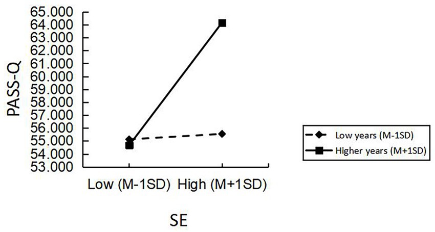 The number of years athletes have engaged in training may moderate the relationship between SE and PASS, thereby influencing its underlying psychological mechanisms. In this sense, training years may serve as an important boundary condition in the association between SE and PASS. According to sociometer theory, SE functions as an internal monitor of one’s perceived social acceptance, and its role may be reinforced through long-term competitive experiences (Leary and Baumeister, 2000) Athletes with longer training years accumulate greater experience in team interactions and coach feedback (Kristiansen and Roberts, 2010), which may strengthen their ability to integrate external support cues based on SE. Furthermore, the broaden-and-build theory (Fredrickson and Branigan, 2005) suggests that positive emotions expand cognitive scope by building “psychological resources” over time. Similarly, long-term training may foster Decentering, enabling athletes to detach more effectively from negative thoughts (Bühlmayer et al., 2017). On this basis, the present study hypothesizes that training years positively moderate the effect of SE on PASS, such that the longer the training years, the stronger the positive predictive effect of SE on PASS.