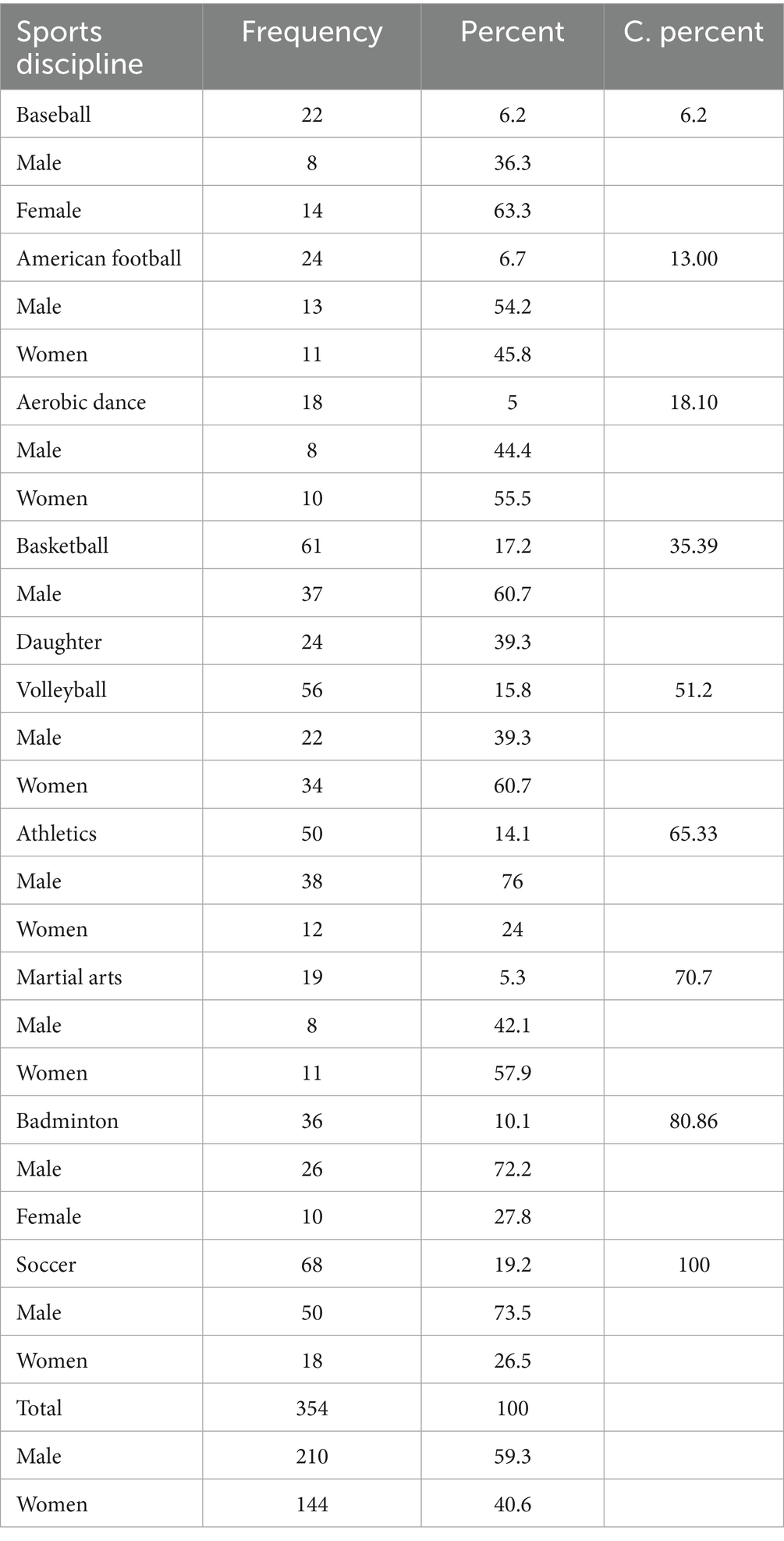The participants were specialized athletes from a sports university in Xi’an, totaling 377. After excluding 23 invalid questionnaires, 354 valid questionnaires remained. Among these, 108 were National First-Class athletes, and 246 were National Second-Class athletes. There were 210 male students and 144 female students. The average age was 20.39 ± 2.16 years. There were 40 individuals with 1–2 years of training, 57 with 3–4 years, 83 with 5–7 years, and 174 with more than 7 years. The sports disciplines included baseball, football, aerobics, basketball, volleyball, and track and field, as detailed in Table 1.