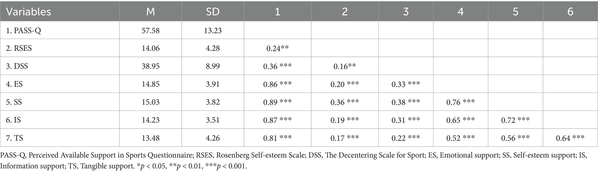 Independent samples t-test showed that athletes of different genders showed significant differences in perceptual social support (t = 2.76, p < 0.001), SE (t = 2.22, p < 0.01), and Decentering (t = 2.00, p < 0.05), and that male students scored higher than female students. Athletes with different years of training showed a significant difference in perceptual social support (F = 2.86, p < 0.05) Athletes with high years of training scored more than athletes with low years of training. Athletes’ perceptions of social support and its four dimensions of emotional support, SE support, informational support, and tangible support were significantly and positively correlated with SE and Decentering, and the results of the descriptive statistics are shown in Table 2.