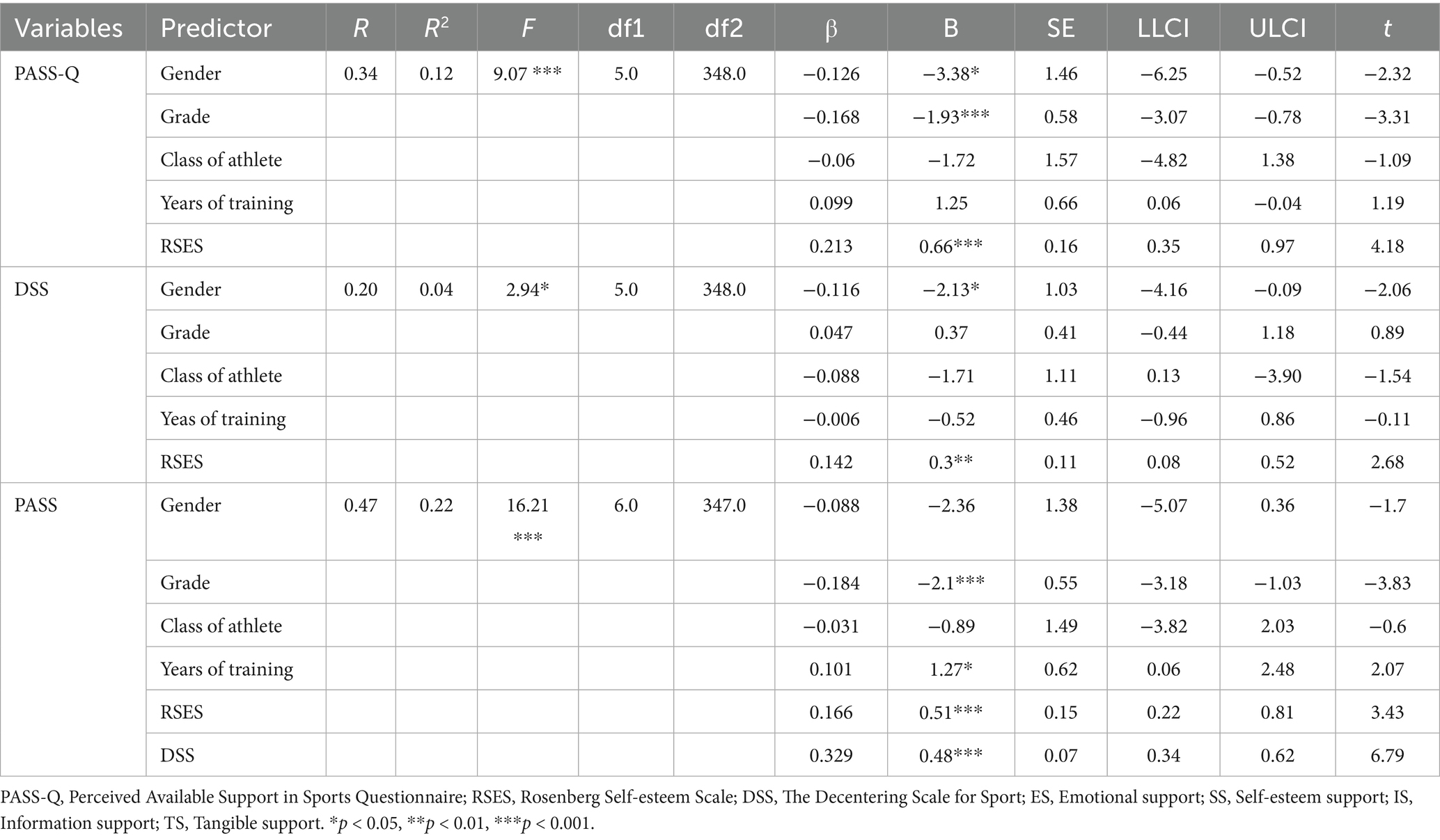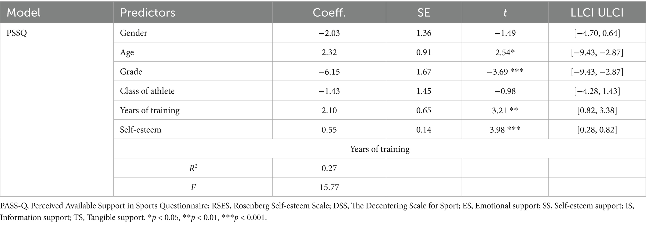 For athletes, self-esteem (SE) is a critical factor influencing athletic performance in competitive contexts. Athletes with higher levels of SE tend to demonstrate superior performance outcomes (Dahiya and Gupta, 2021). Previous research has also shown that individuals with higher SE possess a stronger ability to perceive support from various sources (Ikiz and Cakar, 2010), and the present study further corroborates this finding. Campbell et al. explained this phenomenon by noting that individuals with low SE are more likely to doubt their self-worth, engage in self-blame, experience distrusting relationships (Campbell et al., 2005), and exhibit heightened sensitivity to rejection (Downey et al., 2005). Drawing upon Sociometer Theory, which conceptualizes SE as a psychological gauge monitoring risks of social exclusion, such tendencies can be understood as follows: individuals with low SE, due to their hypersensitivity to “social rejection threats” may develop cognitive biases and defensive strategies in the perception of social support (Leary and Baumeister, 2000). Such defensive strategies may undermine the ability to perceive social support. The analysis confirms Hypothesis 2: SE is significantly and positively correlated with PASS, and SE serves as a significant positive predictor of athletes’ perceptions of available social support.