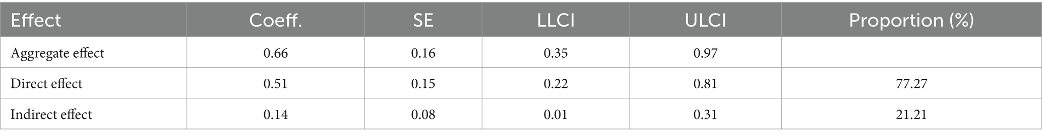 Athlete SE significantly and positively predicted Decentering (B = 0.3, 95% confidence interval of [0.08, 0.52, p < 0.01). Athlete Decentering significantly and positively predicted PASS (B = 0.48, 95% confidence interval [0.34, 0.62], p < 0.001). Athletes’ SE significantly and positively predicted PASS (B = 0.51, 95% confidence interval of [0.22, 0.81], p < 0.001) (shown in Table 3). The use of the PROCESS model 4, showed that Decentering of the self was a mediating variable in the athletes’ SE to improve PASS. The indirect path SE → DSS → PASS (β = 0.14, 95%CI [0.01, 0.31]) which did not include zero. This indicates that the path is significant (shown in Table 4). Consequently, athletes’ Decentering acts as a partial mediator in the relationship between SE and their perception of social support, accounting for 21.21% of the total effect.