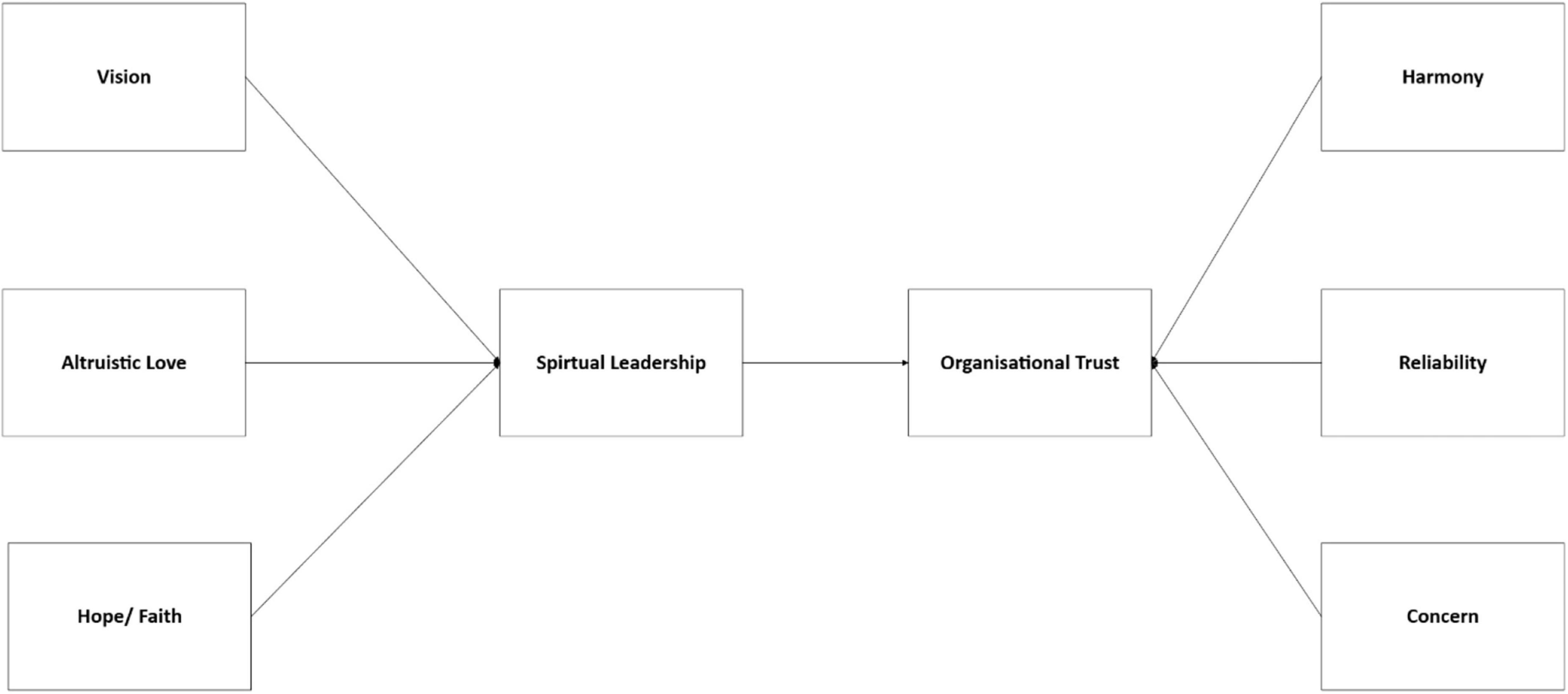 Hence, this study main objective: to examine the impact of spiritual leadership represents by dimensions namely vision, altruistic love, and hope/faith on organizational trust that represents by dimensions namely harmony, reliability and concern.