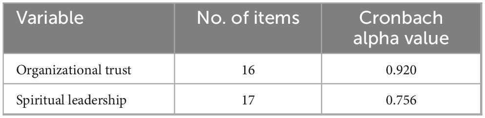 Hair et al. (2006) stated that Cronbach alpha 0.70 value as the minimum cutoff standard, this presents as the benchmark for this test. The Cronbach’s Alpha results for each variable in the current study are as follows: Organizational Trust was assessed using all 16 questions, yielding a Cronbach’s α value of 0.920. The 17 components of Spiritual Leadership yielded a Cronbach’s α value of 0.756 as shown in Table 1.