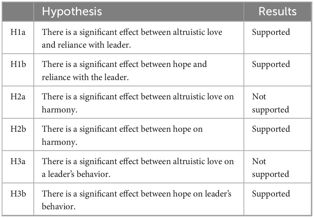 As shown in Table 6 the R2-value is 0.456, or 45.6%, which is noteworthy as it exceeds 25% (Hair et al., 2010). This signifies the sufficiency of the R square value in assessing the correlation between the observed and predicted criterion variable (Hair et al., 2010). The regression analysis indicated that altruistic love and hope significantly predict harmony at a level of P < 0.05. Upon examining the substantial value (p ≤ 0.05) and Beta coefficients (β), it is evident that only hope exerts a significant and positive influence on leaders’ behavior, with a β value of 0.675, indicating that hope accounts for 67.5% of leaders’ behavior.