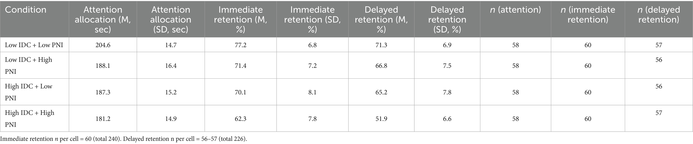 Data were analyzed using a combination of SPSS AMOS 29, R (lavaan package), and Tobii Pro Lab software. To assess the primary hypotheses, a series of 2 × 2 between-subjects ANOVAs was used to evaluate the main and interaction effects of IDC and PNI on attention and retention scores. Mixed ANOVAs were used to compare immediate and delayed retention across conditions, allowing for the assessment of memory decay over time. Mediation hypotheses were tested using bootstrapped structural equation modeling (SEM) with 5,000 resamples to generate confidence intervals for indirect effects. The path model included IDC and PNI as exogenous variables, attention allocation as the mediator, and retention performance as the outcome. Model fit indices, such as RMSEA, CFI, and SRMR, were reported to evaluate the model’s adequacy. For the 2 × 2 ANOVAs, we conducted simple effects tests and planned contrasts (each cell vs. the Low IDC–Low PNI control), and we report estimated differences with 95% CIs and standardized effect sizes. This approach adheres to best practices for interpreting interactions and avoids dichotomous ‘buffering/mitigation’ claims (Lakens, 2013; Hayes, 2022; Preacher et al., 2006; Spiller et al., 2013).