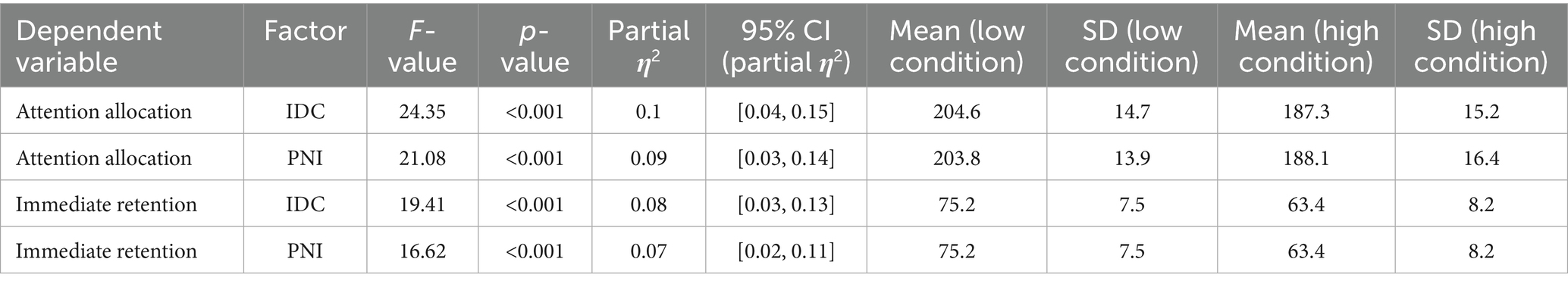 Table 2. Main effects of IDC and PNI on attention allocation and immediate retention.