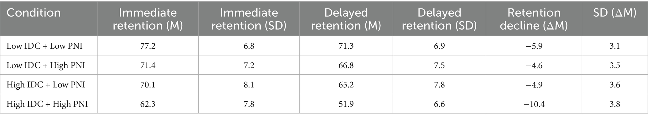A 2 (IDC) × 2 (PNI) × 2 (Time: Immediate vs. Delayed) mixed ANOVA revealed a significant main effect of time, F(1, 222) = 41.56, p < 0.001, partial η2 = 0.16, confirming that retention scores declined over time across all conditions, indicating overall memory decay. Time also interacted with IDC, F(1, 222) = 5.87, p = 0.017, partial η2 = 0.03, and with PNI, F(1, 222) = 4.41, p = 0.037, partial η2 = 0.02, suggesting that forgetting rate varied across these factors. The largest decline occurred in the high IDC + high PNI condition (ΔM = −10.4%, SD = 3.8, Cohen’s d ≈ 1.25), whereas all other conditions showed smaller decreases ranging from −4.6% to −5.9% (Cohen’s d ≈ 0.60–0.75). This pattern indicates that the joint presence of high IDC and frequent PNI exacerbated short-term forgetting more than either factor alone. However, the interaction effect sizes (partial η2 = 0.02–0.03) suggest this amplification, while meaningful, was moderate in magnitude (Table 3).