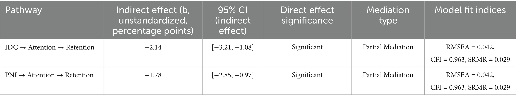 Using bootstrapped SEM with 5,000 resamples, attention allocation was examined as a mediator between IDC, PNI, and retention performance. The model showed good fit (RMSEA = 0.042, CFI = 0.963, SRMR = 0.029), suggesting the hypothesized relationships aligned well with the observed data. Significant but modest indirect effects were found for both predictors. Higher IDC was associated with reduced retention through decreased attention allocation (unstandardized indirect effect b = −2.14 percentage points, 95% CI [−3.21, −1.08], small-to-moderate magnitude), and greater PNI showed a similar pathway (unstandardized indirect effect b = −1.78 percentage points, 95% CI [−2.85, −0.97], small magnitude). In both cases, direct effects on retention remained significant, indicating partial rather than full mediation. Indirect effects were estimated with a nonparametric bootstrap (5,000 resamples), a recommended practice for mediation inference (Hayes, 2022). These results support H4a and H4b, with the caveat that while the mediation effects are statistically reliable, their magnitudes suggest that other factors beyond attention allocation also contribute meaningfully to the observed performance differences (Table 4).