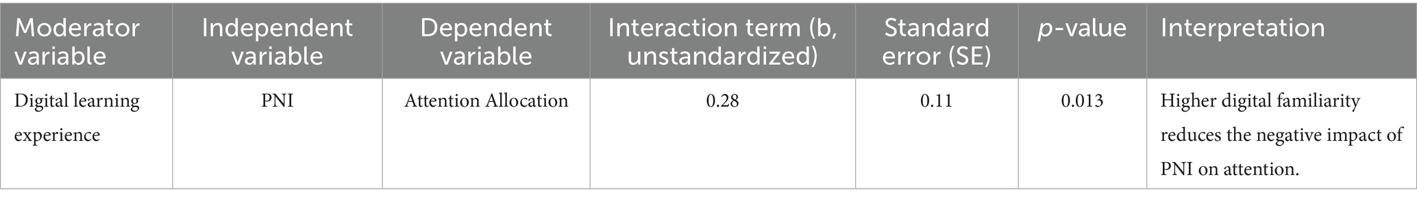 An exploratory moderation analysis was conducted using Hayes’ PROCESS macro (Model 1) to examine whether individual differences in digital learning experience influenced the relationship between PNI and attention allocation. Analyses used PROCESS Model 1 with heteroskedasticity-consistent SEs and 5,000 bootstrap resamples (Hayes, 2022). The digital learning experience was assessed through pre-study self-reported ratings of familiarity with online learning tools and the frequency of participation in virtual courses. The interaction between PNI and digital learning experience was statistically significant, b = 0.28 (unstandardized), SE = 0.11, p = 0.013, 95% CI [0.06, 0.50], indicating a small to moderate moderating effect. Learners with higher digital familiarity showed a less pronounced reduction in attention under high-distraction conditions compared to those with lower familiarity. However, no moderation effect emerged for cognitive load, suggesting that while prior digital experience may buffer against environmental interference, it does not appear to mitigate the cognitive strain caused by complex instructional design (Table 5).