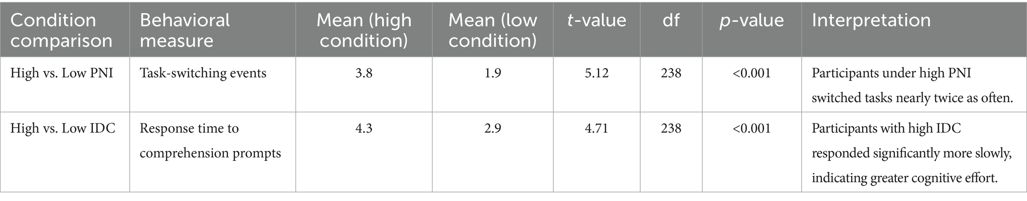 Behavioral metrics provided additional support for the main findings. Participants in high PNI conditions exhibited significantly more task-switching events (M = 3.8, SD = 1.2) than those in low PNI conditions (M = 1.9, SD = 0.9), t(238) = 5.12, p < 0.001, Cohen’s d = 0.66, indicating a medium-to-large effect consistent with greater attentional fragmentation and reduced sustained focus. Similarly, response times to embedded comprehension prompts were significantly longer in high IDC conditions (M = 4.3 s, SD = 1.0) compared to low IDC conditions (M = 2.9 s, SD = 0.8), t(238) = 4.71, p < 0.001, d = 0.61, reflecting a medium effect size and suggesting increased cognitive processing demands under more complex instructional design. While these patterns align with the primary experimental results, they should be interpreted as supplementary indicators rather than definitive evidence of causal mechanisms, as they do not independently establish the direction of influence. The findings provide converging evidence that both PNI and IDC contribute to heightened cognitive strain and reduced learning efficiency (Table 6). The notification-related pattern is consistent with interruption/notification research, which shows costs even in the absence of user interaction (Ohly and Bastin, 2023). Additionally, first−/second-pass eye-movement indicators showed longer first-pass durations on AOI-Core under High IDC (vs. Low IDC), and greater second-pass time/regressions to AOI-Core when PNI was present, consistent with initial integration demands and subsequent repair/reintegration (Appendix Table A3).