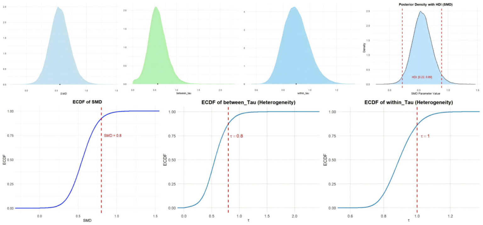 ![Three density plots are shown at the top, labeled as SMD, between_tau, and within_tau. The rightmost plot includes an HDI [0.22, 0.89]. Below, there are three ECDF plots: SMD, between_Tau (Heterogeneity), and within_Tau (Heterogeneity). Each plot has a red dashed line at significant values: 0.8 for SMD and between_Tau, and 1 for within_Tau.](https://www.frontiersin.org/files/Articles/1618617/xml-images/fpsyg-16-1618617-g004.webp)