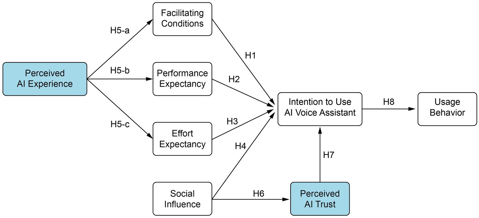 Older adults’ perceived AI experience plays a key role in their decision-making process. When they notice significant improvements in speech recognition accuracy, naturalness of semantic understanding, and fluency of speech synthesis, they also perceive improvements in the infrastructure and support required to use these technologies (Lopatovska, 2020). This enhanced perception not only increases their acceptance of AI voice assistants but also strengthens their awareness of the facilitating conditions needed. Older adults begin to believe that the necessary hardware (such as device availability and network connectivity) and social support (such as help from family or the community) have also been effectively enhanced. Thus, the improvement in perceived AI experience positively influences their perception of facilitating conditions (Qiu and Ishak, 2025; Tu et al., 2023), meaning they are more likely to seek environments and resources that provide robust technical and social support, laying the foundation for wider adoption of AI voice assistants.