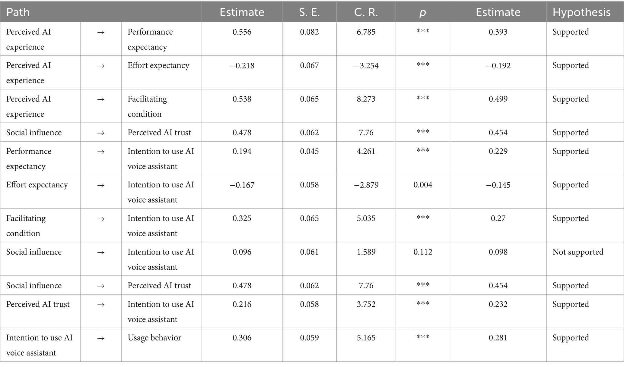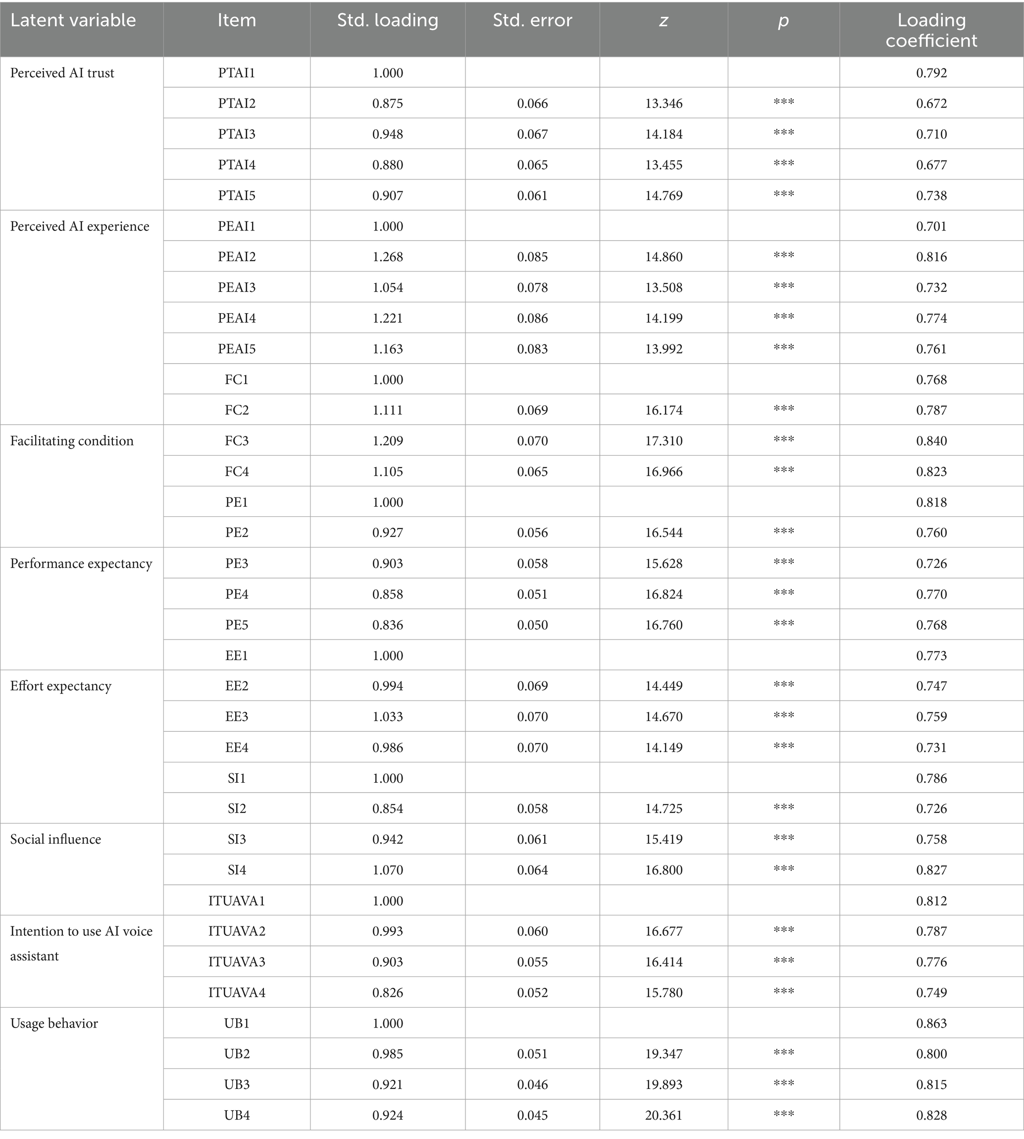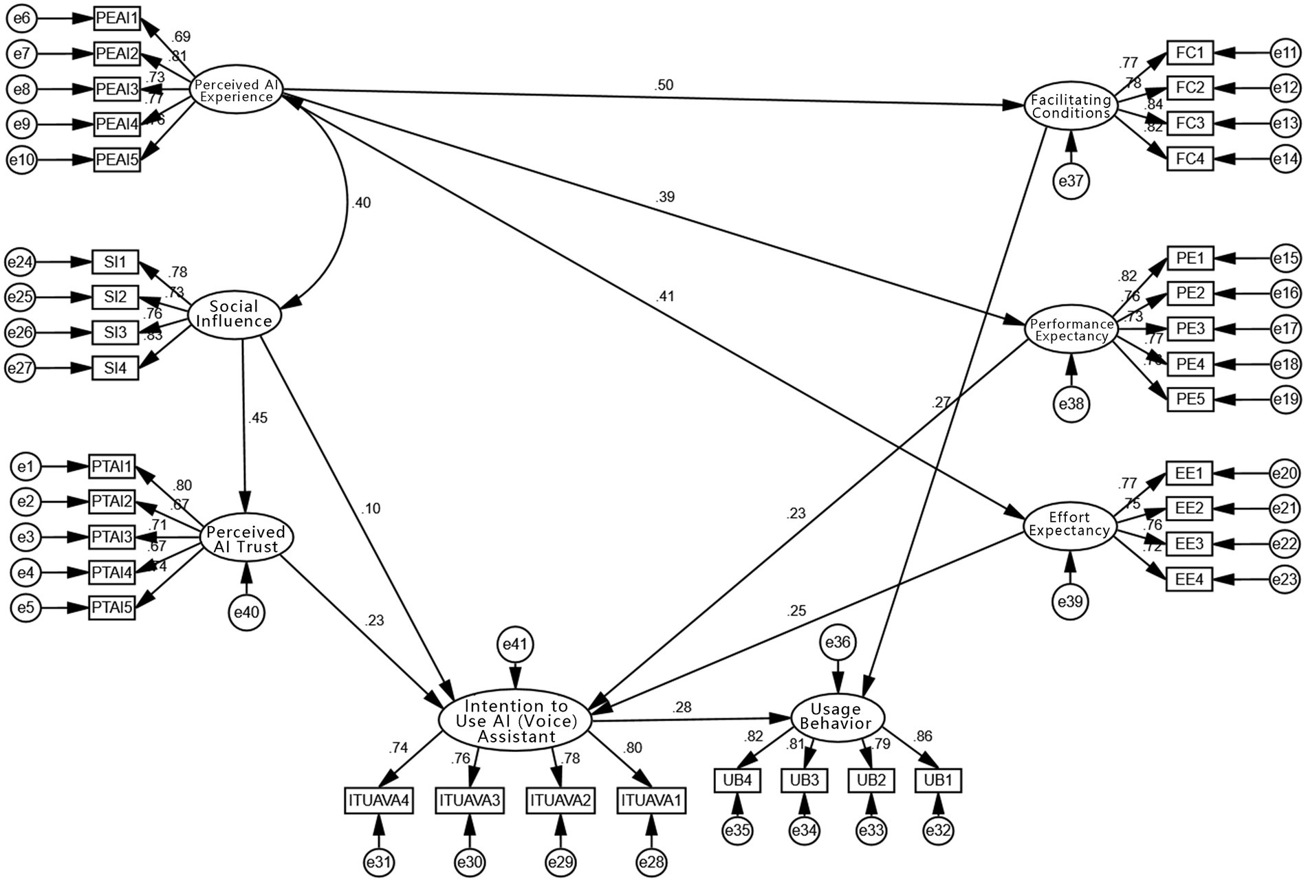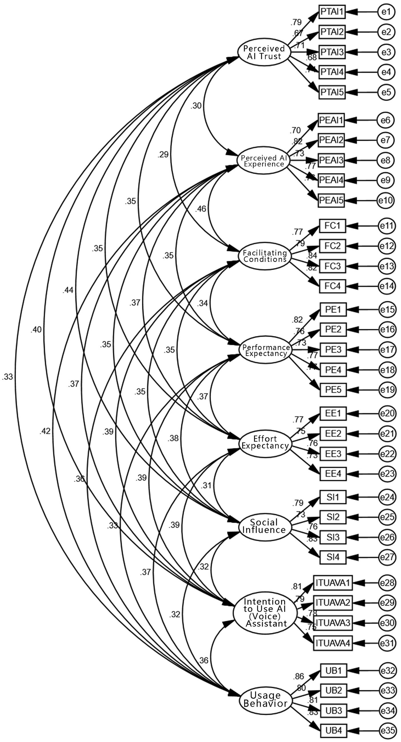 As shown in Figure 3, the path diagram presents the standardized factor loadings obtained from the Confirmatory Factor Analysis (CFA). Each latent construct (e.g., Perceived Trust in AI, Perceived AI Experience) is measured by multiple observed variables, and the model demonstrates good convergent and discriminant validity. The CFA results confirm the measurement model’s structure and provide empirical support for the reliability and validity of the latent constructs.