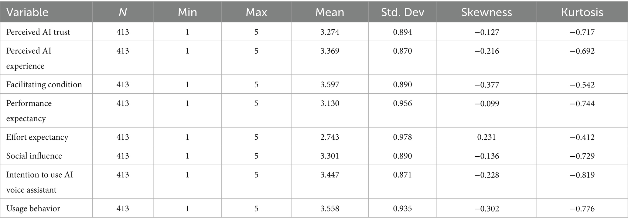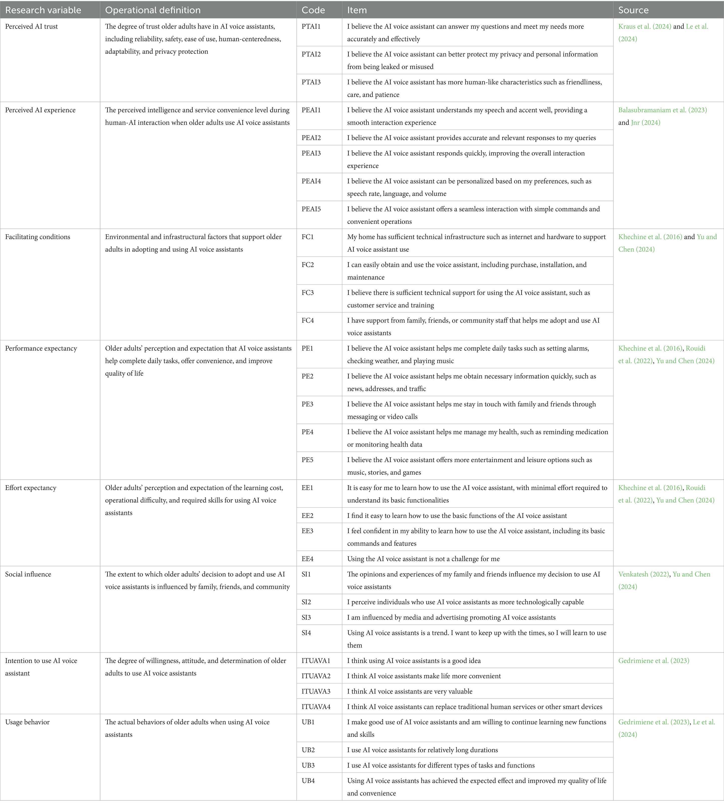 This study adopts the Unified Theory of Acceptance and Use of Technology (UTAUT) framework to explore the key factors influencing elderly individuals’ acceptance and usage of AI voice assistants. According to the UTAUT model, technology acceptance and use are determined by four main factors: performance expectancy, effort expectancy, social influence, and facilitating conditions (Akdim and Casaló, 2023; Kernan Freire et al., 2023). First, older adults’ expectations that AI voice assistants can improve quality of life and health management, which refers to performance expectancy, play a significant role in their acceptance. Second, the perceived ease of use, or effort expectancy, is especially crucial for this demographic. Social influence reflects the extent to which support from family and friends can positively impact technology acceptance, particularly when these individuals have prior experience with the technology. Finally, facilitating conditions refer to whether older adults have the necessary resources such as devices, internet connectivity, and learning support; the lack of such conditions can significantly reduce their willingness to adopt the technology. Compared with earlier studies, recent developments in UTAUT emphasize the importance of social support and psychological factors in influencing elderly users’ acceptance of technology, particularly in populations where the digital divide is pronounced (Wang et al., 2024; Yu and Chen, 2024). As technology and society evolve, changes in performance expectancy, effort expectancy, social influence, and facilitating conditions have led to a greater willingness among older adults to embrace new technologies.