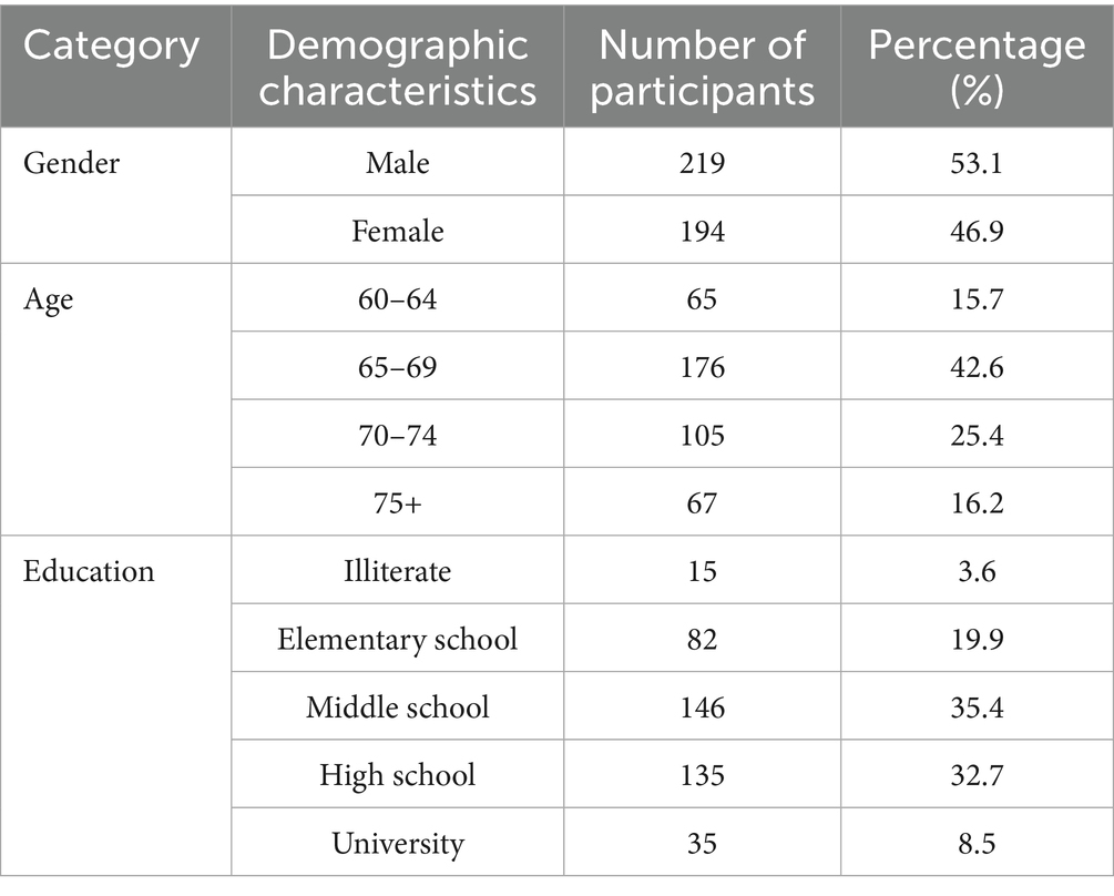 A total of 413 valid responses were collected. The demographic information of the participants is shown in Table 2. Among them, 53.1% were male, and 46.9% were female. In terms of age distribution, the majority of participants were aged 65–69 (42.6%), followed by those aged 70–74 (25.4%), 75 and above (16.2%), and 60–64 (15.7%). Regarding education levels, most participants had completed junior high school (35.4%) or high school (32.7%), while 19.9% had completed only primary school, and 8.5% had a college education. Notably, 3.6% of the participants were identified as illiterate. To address this, trained researchers and community volunteers assisted illiterate participants during the survey to ensure their full understanding and successful completion of the questionnaire.