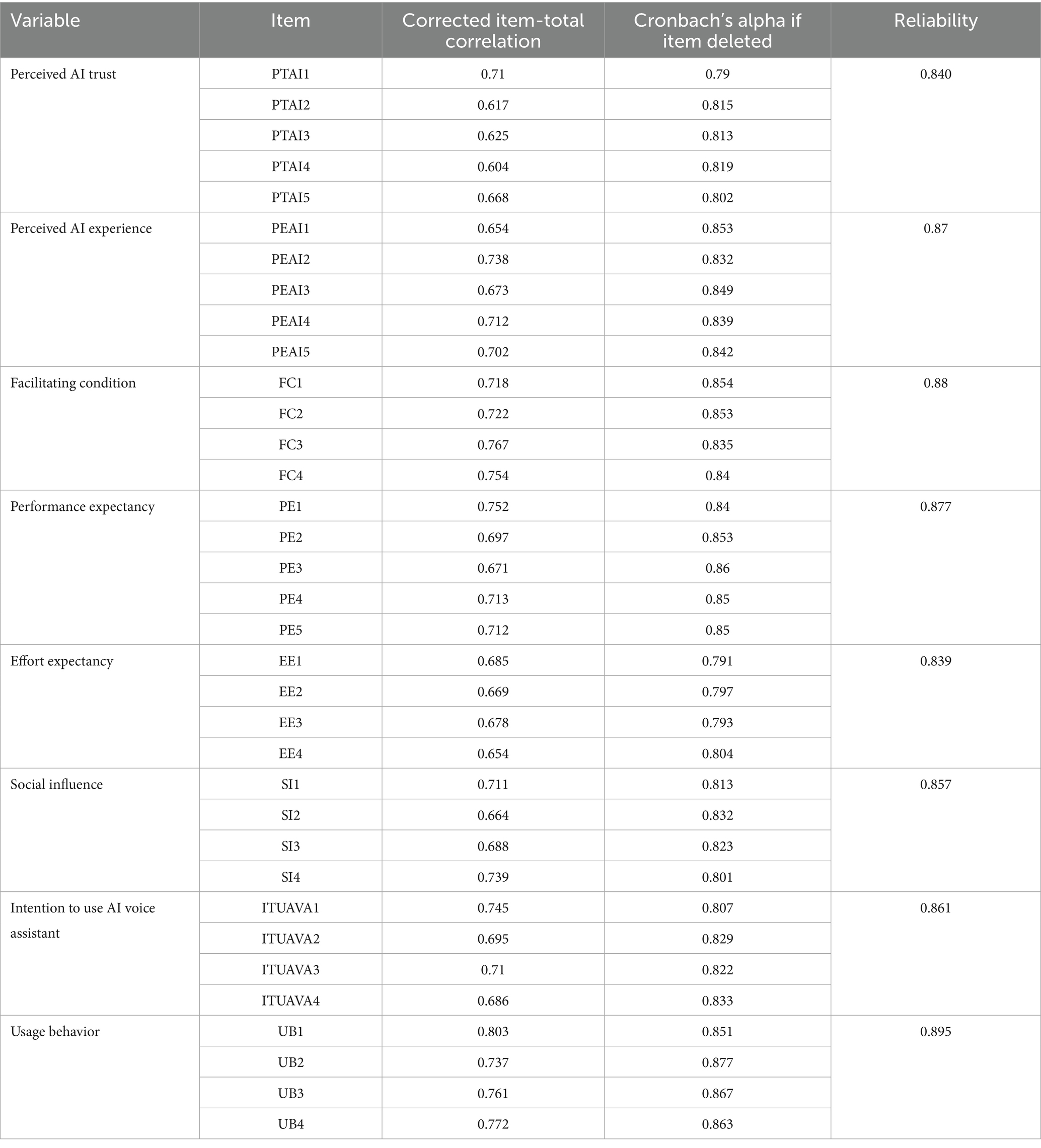 Reliability analysis, also referred to as internal consistency analysis, is used to evaluate the stability, consistency, and dependability of measurement results. To ensure the accuracy of the findings, a reliability test was performed on valid questionnaire data before conducting further analysis. In social science research, Cronbach’s Alpha coefficient is commonly used to assess reliability. Generally, a coefficient above 0.9 indicates excellent reliability; between 0.8 and 0.9 is considered very good; between 0.7 and 0.8 is acceptable; between 0.6 and 0.7 is marginally acceptable; and below 0.6 suggests the need for revision.