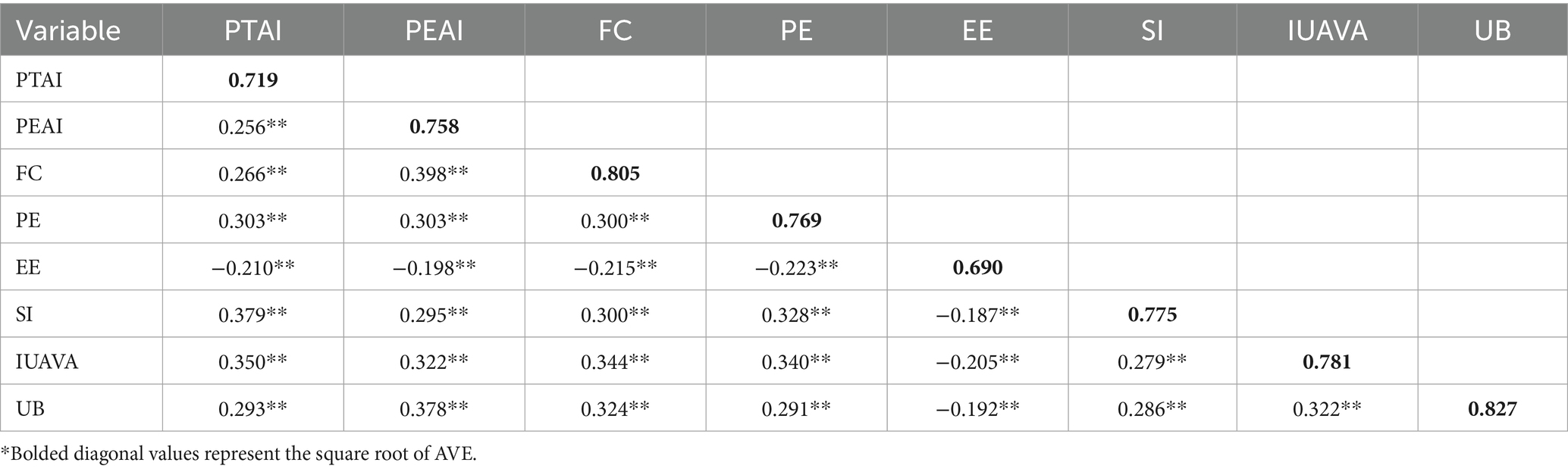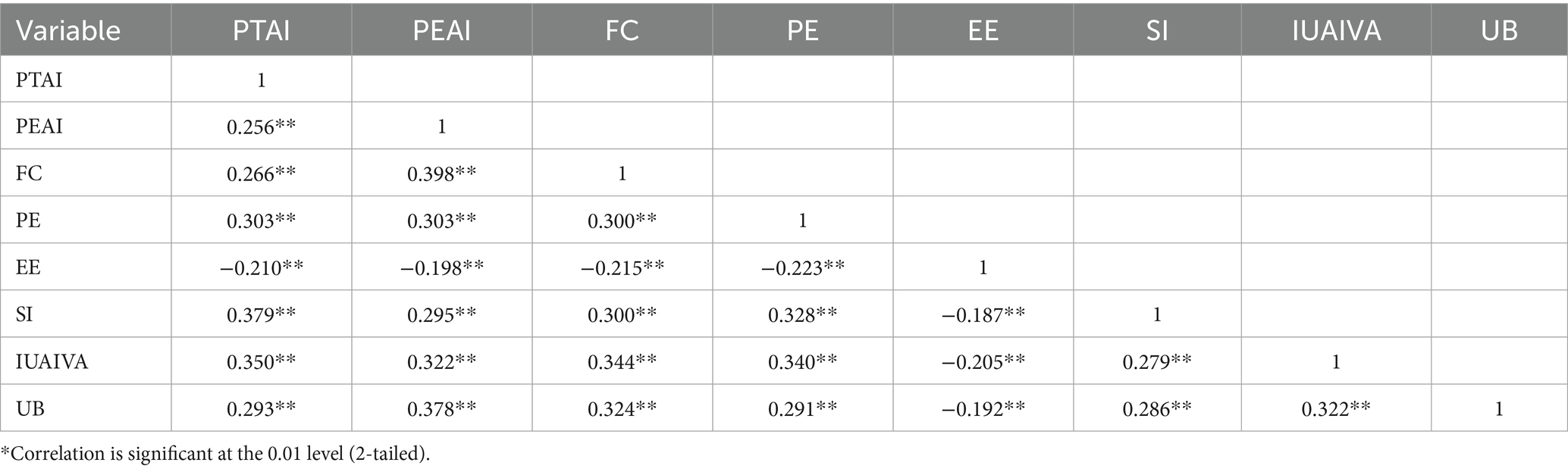 From the Table 6, all variables show significant correlations with each other. Specifically, the correlation between perceived trust and usage behavior is 0.293 (p < 0.01), indicating a significant positive relationship. The correlation between perceived experience and usage behavior is 0.378 (p < 0.01), suggesting a strong positive influence of perceived experience on behavior. Facilitating conditions correlate with usage behavior at 0.324 (p < 0.01), indicating that improved facilitating conditions enhance usage behavior. Performance expectancy shows a positive correlation of 0.291 (p < 0.01) with usage behavior, confirming its significant role.