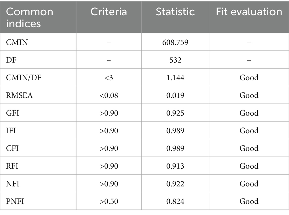 As shown in the Table 7, the CMIN/DF value is 1.144, which is less than 3; RMSEA is 0.019, below the threshold of 0.08, indicating a good fit. GFI (0.925), IFI (0.989), CFI (0.989), RFI (0.913), and NFI (0.922) all exceed the recommended 0.90 threshold. PNFI is 0.824, which is greater than 0.50. All goodness-of-fit indices meet standard benchmarks, indicating that the model fits well (Figure 4).