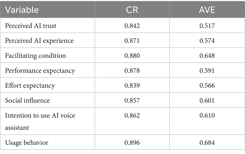 CR (Construct Reliability) is calculated using factor loadings and represents internal consistency. Values above 0.7 are considered acceptable. AVE (Average Variance Extracted) represents the degree of convergent validity. Values above 0.5 are generally acceptable. In this study, all CR values are above 0.7, and all AVE values exceed 0.5, indicating good convergent validity (see Table 9).