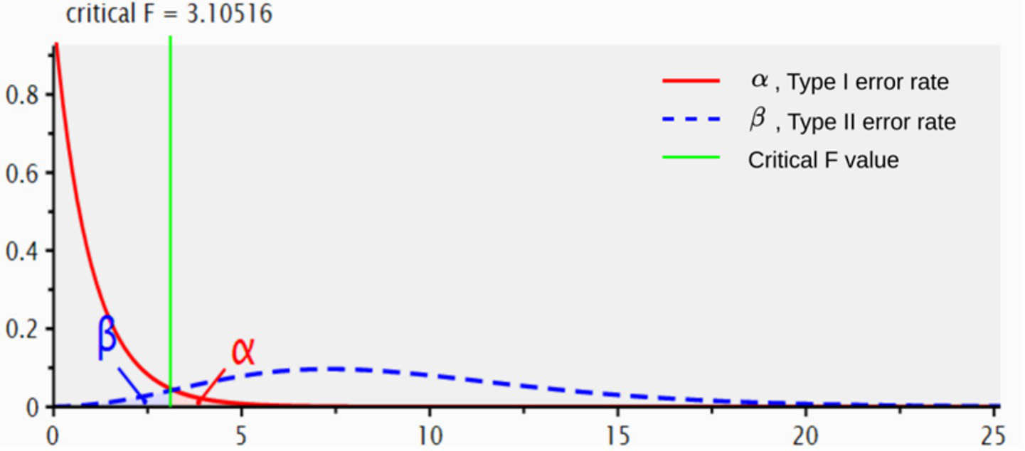 In Figure 1, the x-axis represents F-values. As the F-value increases, the probability of Type I error (α, red curve) gradually decreases, while the probability of Type II error (β, blue curve) stabilizes. Larger F-values indicate more significant between-group differences. The green vertical line marks the critical F-value (3.10516 in this figure). If the calculated F-value exceeds this critical threshold, the null hypothesis can be rejected, confirming significant differences.