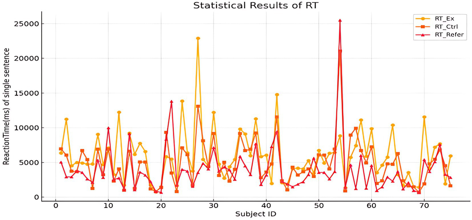 The initial study planned to recruit 75 participants, exceeding the minimum requirement of 43. This provides buffer space for potential data cleaning or participant attrition while enhancing statistical power and result robustness. This analysis treated participants’ reaction times (RT) across three types of sentences (experimental irony, control irony, baseline sentences) as dependent variables: RT_Ex, RT_Ctrl, RT_Refer (unit: ms), with a repeated-measures ANOVA. All 75 valid participants were included, and data were analyzed by using SPSS.