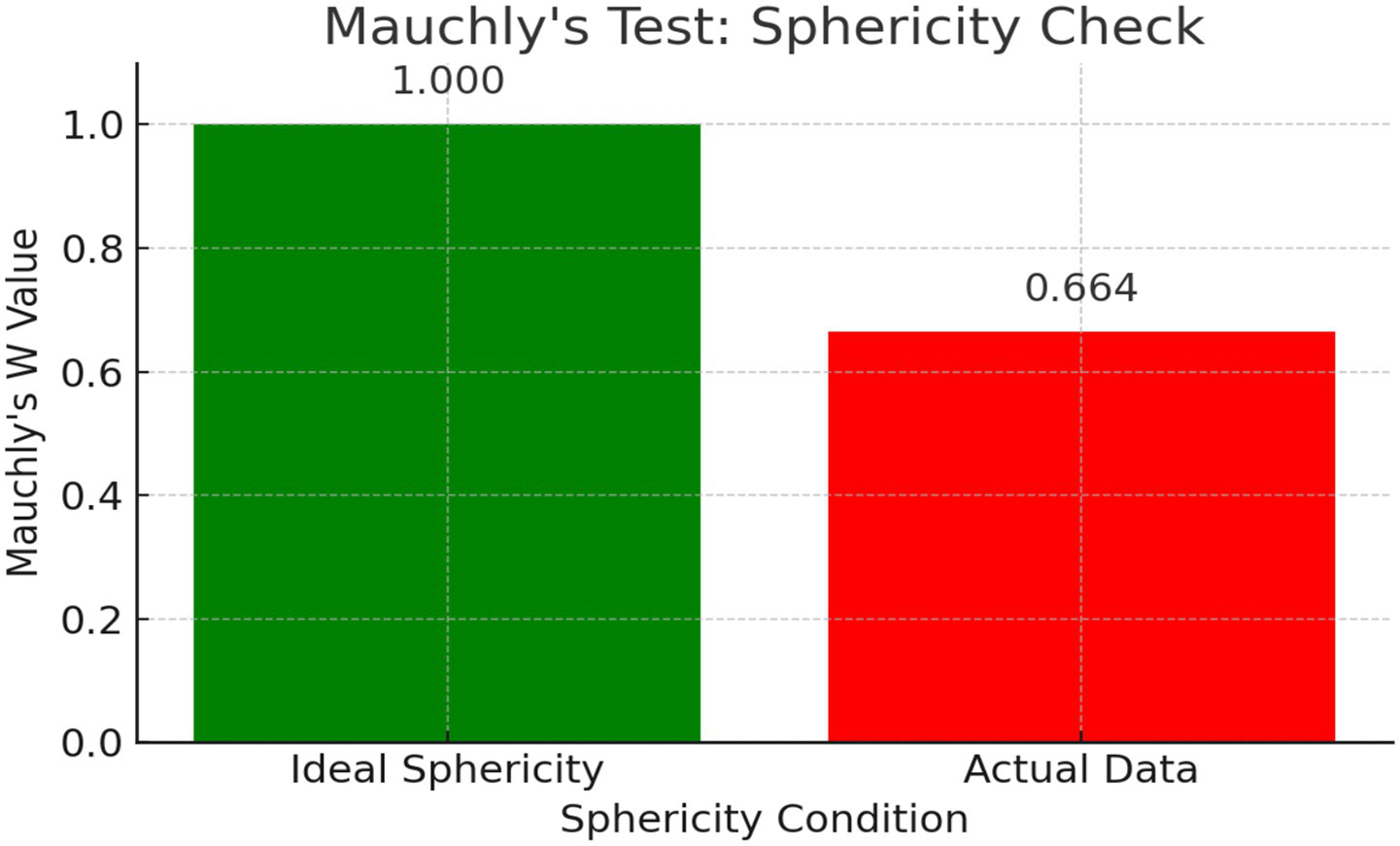 Mauchly’s W statistic quantifies sphericity deviation (W = 0.664 suggests notable departure from ideal sphericity, as visualized in Figure 3).