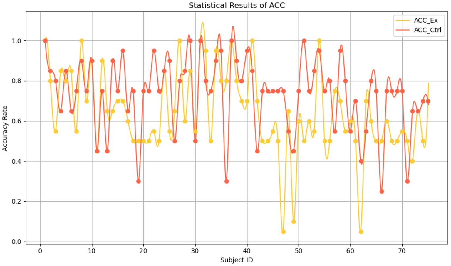 Figure 4. Accuracy rates across participants for experimental and control irony conditions. Each line represents a participant’s accuracy rate in the experimental irony condition (ACC_Ex, yellow line) and the control irony condition (ACC_Ctrl, red line). The y-axis indicates the proportion of correct responses (0.0–1.0), and the x-axis represents individual subject ID (1–75). Only ironic sentences were included in the accuracy analysis; literal baseline sentences were excluded due to lack of inferential demands.