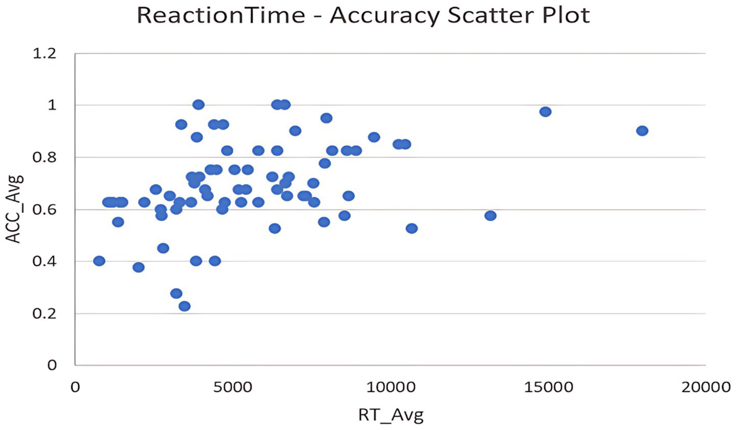 As illustrated in the scatter plot (Figure 5), the overall pattern supports the presence of a speed-accuracy tradeoff in irony comprehension: participants who took more time tended to achieve higher accuracy.
