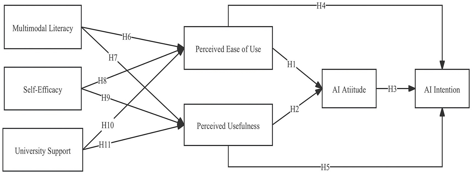 To account for the variability in adoption behaviors, this study employed the technology acceptance model (TAM), which says that how useful people think something is (i.e., its perceived usefulness [PU]) and how easy they think it is to use (i.e., its perceived ease of use [PEOU]) are the main factors that decide how people judge and act toward new technologies (Chen et al., 2024). Multimodal literacy (ML) (Slimi, 2023), self-efficacy (SE) (Fan and Cui, 2024), and university support (US) (Sova et al., 2024) are presumed to affect students’ adoption of AI tools (Yao and Wang, 2024), but the processes by which these relationships occur remain underexplored. That may be because prior TAM-based studies have typically emphasized broad psychological determinants and have paid less attention to the specific learner competencies and institutional contexts relevant to educational technologies. Given the rapidly evolving educational environment and increasing complexity of digital tool adoption, there is a clear need to revisit and extend existing acceptance models to better reflect contemporary higher-education contexts. This research therefore addresses that critical gap by explicitly examining how ML, SE, and US affect students’ acceptance of AI technologies in academic contexts.