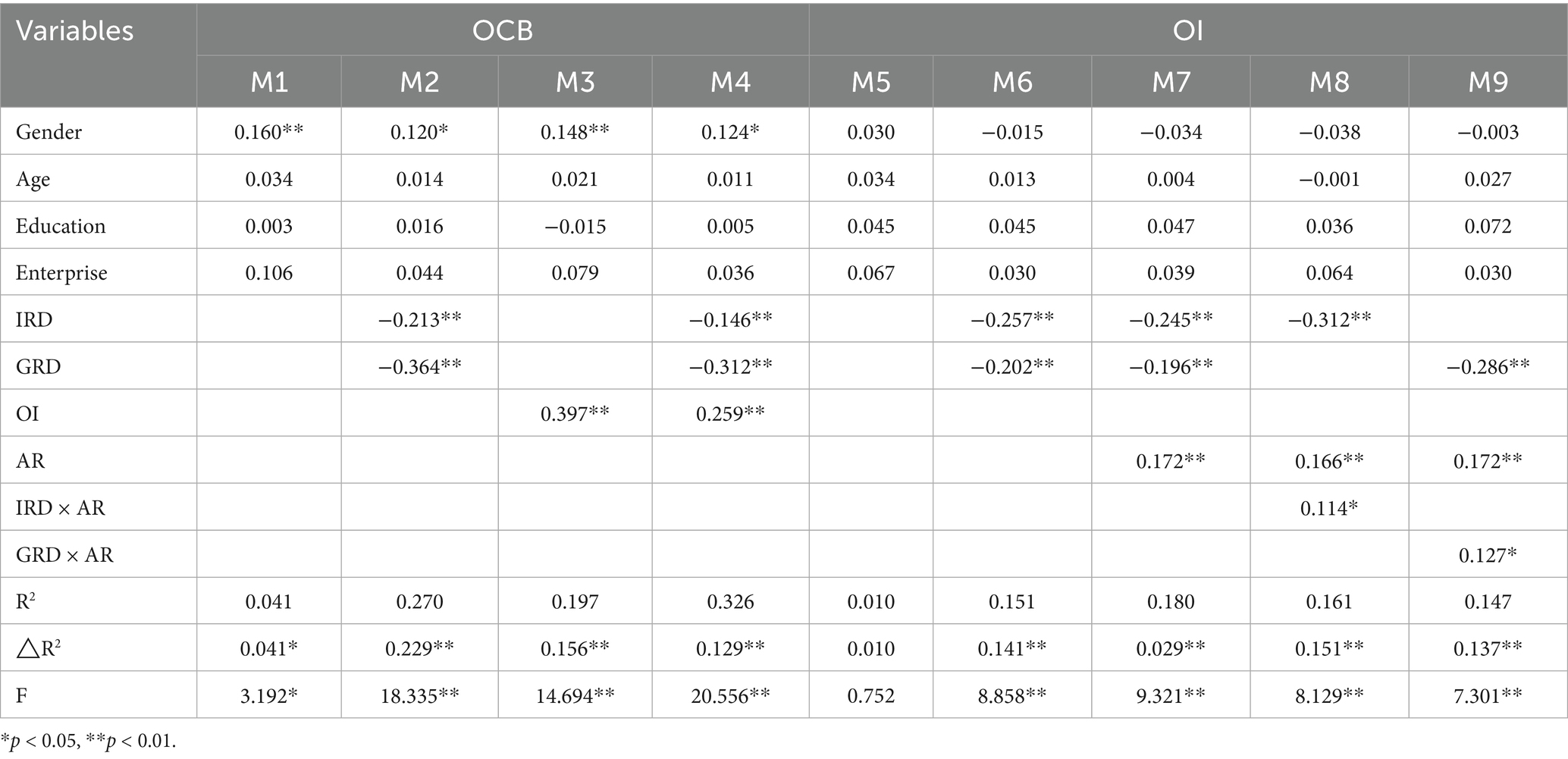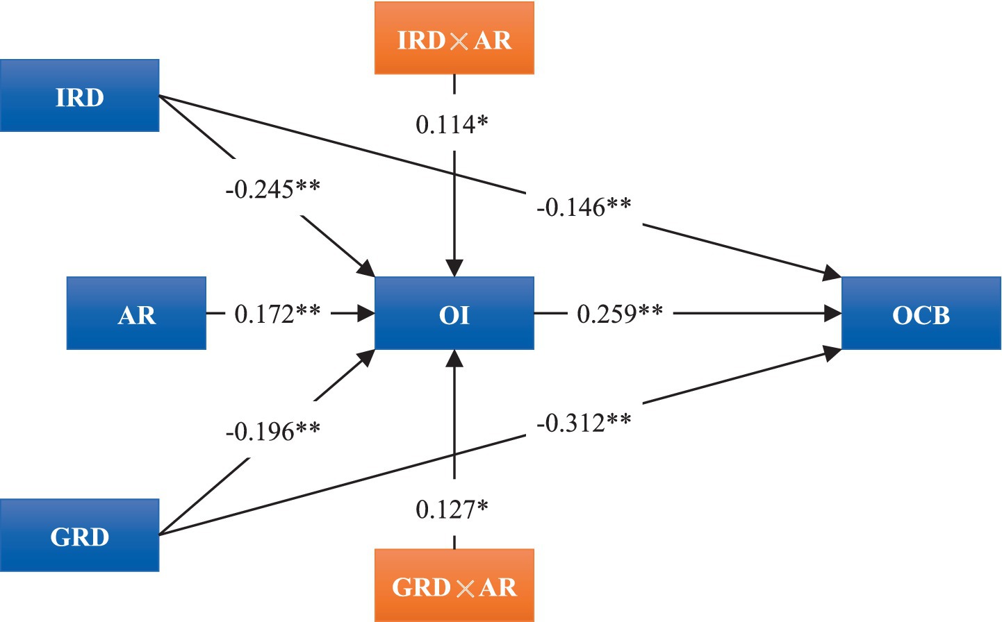 Figure 2 depicts the relationship model derived from the regression analysis conducted in this study. It clearly demonstrates the direct effects of IRD, GRD, and OI on OCB, as well as the direct effects of IRD and GRD, along with their interaction terms with AR, on OI.