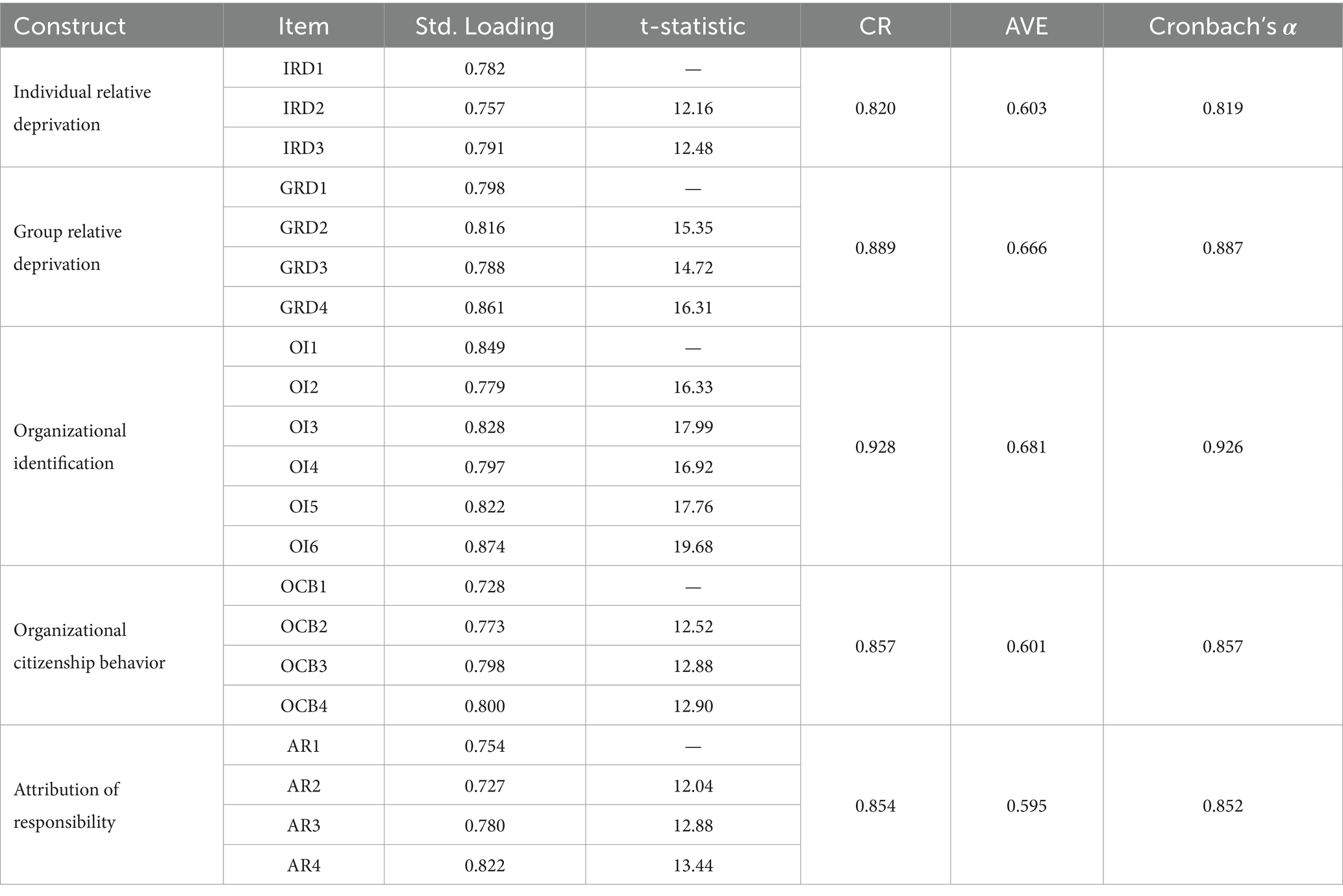The measurement scales used in this study were adapted from validated instruments found in the existing literature, with contextual modifications to ensure theoretical alignment and methodological rigor of the study. IRD was operationalized using the three-item scale developed by Tropp and Wright (1999). GRD was assessed using a refined version of Liang et al.’s (2019) 14-item scale, retaining four items after a systematic screening process to enhance contextual relevance. OI was measured using Mael and Ashforth’s (1992) six-item scale, and OCB was evaluated using a condensed version of Podsakoff et al.’s (1990) instrument, which comprises four context-specific items. AR was measured using a four-item scale validated by Zhang et al. (2020). All scales underwent pilot testing (n = 98) to verify their reliability and remove any ambiguous phrasing. The finalized instruments utilized a 7-point Likert response format ranging from 1 (“strongly disagree”) to 7 (“strongly agree”).