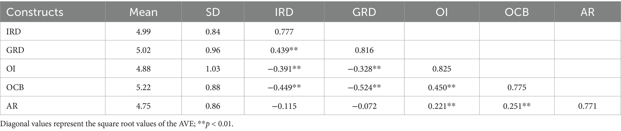 Confirmatory factor analysis (CFA) was conducted to evaluate the validity of the five latent variables: IRD, GRD, OI, OCB, and AR. The model demonstrated a good fit to the data, with the following indices: χ2/df = 2.183, RMSEA = 0.062, GFI = 0.902, AGFI = 0.973, IFI = 0.944, NNFI = 0.934, and CFI = 0.943. These results align with the established thresholds for acceptable model fit.
