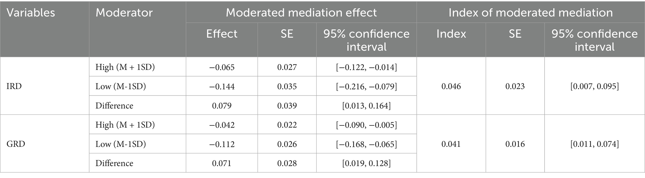 To examine the moderated mediation effects, we employed the SPSS PROCESS macro (Model 7) to calculate the indirect effects of IRD and GRD on OCB through OI at different levels of AR. The results are shown in Table 4.