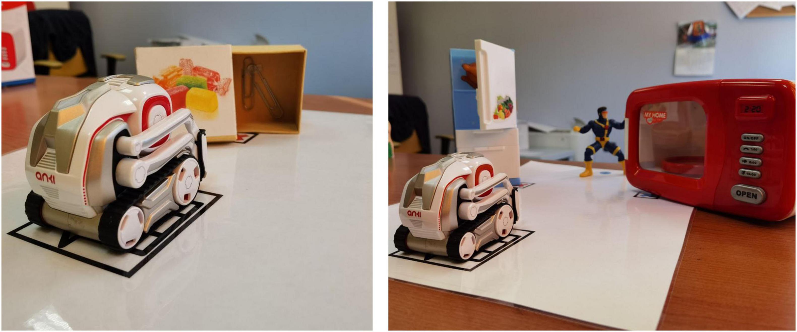 Each session consisted of two tasks: an adaptation of the Deceptive Box Task (Hogrefe et al., 1986) and the Sally–Anne Task (Baron-Cohen et al., 1985). The Deceptive Box Task involved presenting a familiar container (e.g., a candy box) with an unexpected content inside, requiring the child to infer what an uninformed observer (Cozmo) would believe about its contents. In the Sally–Anne Task, Cozmo played the role of Sally, while the child acted as Anne. The robot placed an object in a designated location before “falling asleep” (i.e., deactivating momentarily). During this period, the child, guided by the therapist, moved the object to a new location. Upon “waking up,” Cozmo prompted the child to predict where it would look for the object, assessing their ability to attribute and differentiate mental states.