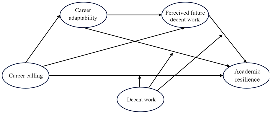 Regarding outcome variables, decent work can directly or indirectly influence wellbeing by fulfilling basic human needs. Moreover, perceptions of future decent work demonstrate similar effects, particularly in mediating pathways between motivational factors like career calling and adaptive outcomes such as academic resilience. Studies focusing on pre-service college students (those yet to enter the workforce) have shown that future decent work perceptions are positively correlated with academic satisfaction (Wen et al., 2023) and negatively correlated with employment anxiety (Wan et al., 2024), suggesting their role in buffering stressors and enhancing persistence in academic pursuits. Further research indicates that these perceptions also serve as a significant positive predictor of resilience (Wen et al., 2024), implying that optimistic views of future work can foster the psychological resources needed to overcome academic challenges, thereby supporting their potential mediating function in linking career calling—a sense of purpose in one's vocational path—to greater resilience. Complementary evidence from Nigerian youth research shows that work volition (a construct related to career calling) predicts future decent work opportunities, and those with better decent work prospects exhibit higher academic satisfaction and career engagement (Ezema and Autin, 2024)—implying that career-related aspirations may translate to academic persistence via enhanced future labor expectations. Moreover, the future dimension of decent work shares isomorphism with hope, as both center on positive future expectations. Given that hope correlates with reduced distress and enhanced adaptive functioning (Feldman and Snyder, 2005; Arnau et al., 2007), this parallel suggests perceived future decent work could mediate the positive effect of career calling on academic resilience by fostering adaptive psychological resources.