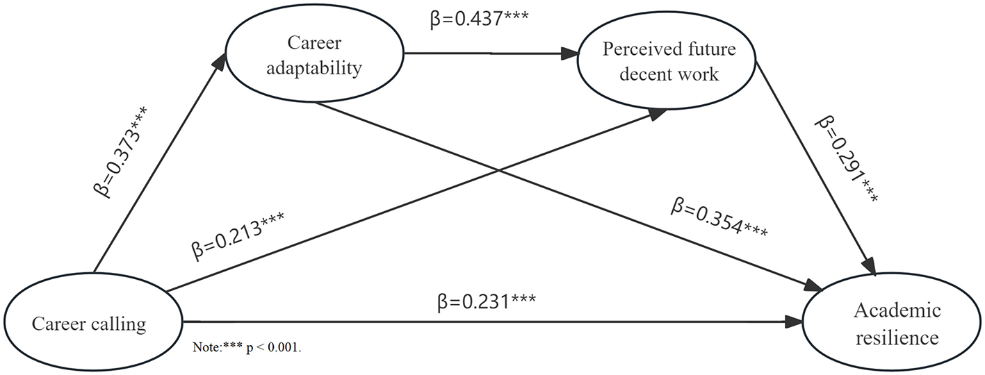 Table 2 reports the means, standard deviations, and correlation analysis results of the variables: (1) Career calling demonstrated significant positive correlations with academic resilience (r = 0.389, p < 0.01), career adaptability (r = 0.308, p < 0.01), and perceived future decent work (r = 0.346, p < 0.01). (2) Career adaptability demonstrated significant positive correlations with academic resilience (r = 0.421, p < 0.01) and perceived future decent work (r = 0.393, p < 0.01). (3)Perceived future decent work was significantly positively correlated with academic resilience (r = 0.428, p < 0.01). These correlation results provide preliminary verification of the aforementioned hypotheses and establish the foundation for subsequent hypothesis testing.