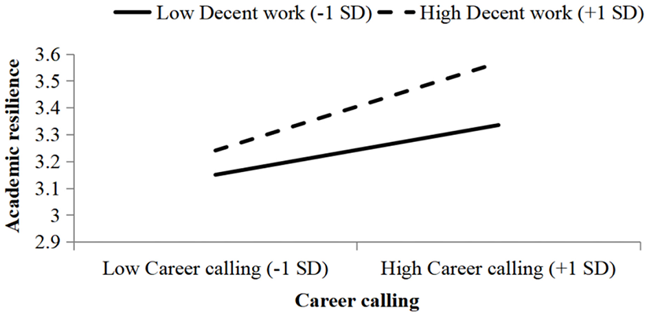 Hypothesis 5 (H5): Decent work positively moderates the relationship between career calling and academic resilience.