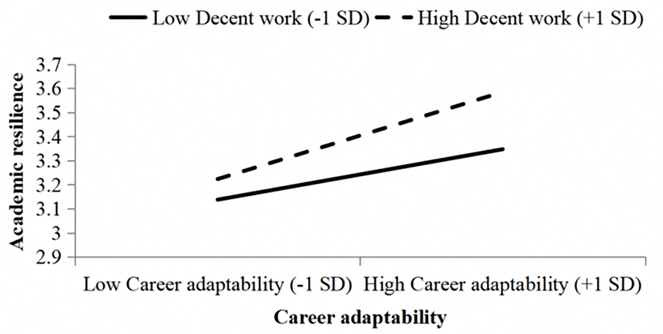 Hypothesis 6 (H6): Decent work positively moderates the relationship between career adaptability and academic resilience.