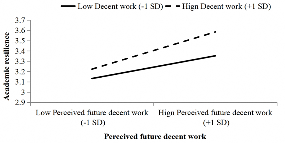 Hypothesis 7 (H7): Decent work positively moderates the relationship between perceived future decent work and academic resilience.