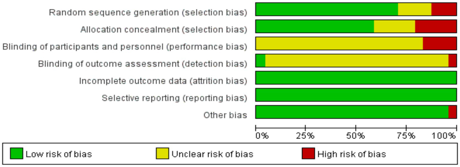 Two independent reviewers performed a risk of bias assessment for the included studies using Review Manager 5.4 (a software provided by Cochrane). After cross-checking their results, they excluded studies identified as low quality. The quality assessment results were categorized as low risk, unclear, or high risk. The assessment criteria covered six domains: randomization, allocation concealment, blinding, incomplete outcome data, selective reporting, and potential additional sources of bias.